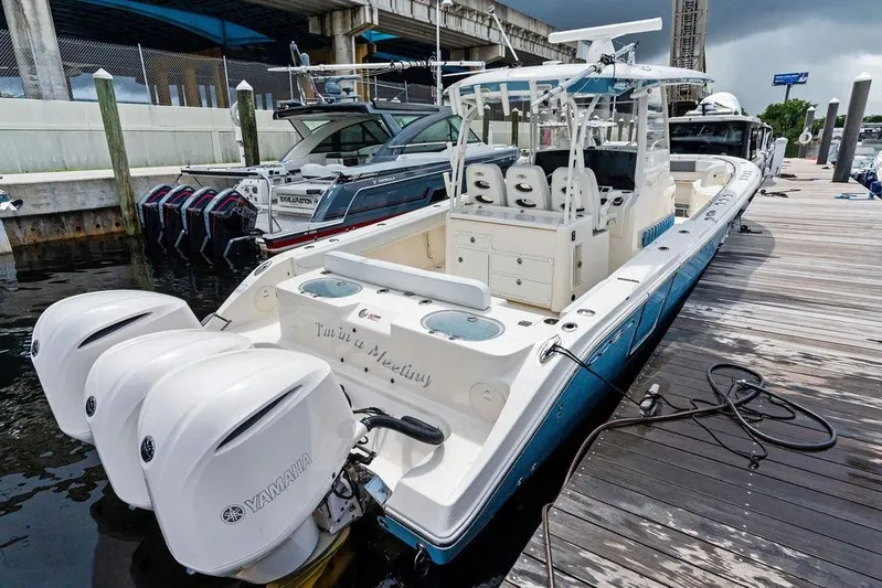 The 350 Center Console fishes hard and plays easy with a rare combination of high style and ultra-performance. A double-stepped hull makes getting to the fishing grounds fast and fuel efficient while elegant topside amenities bathe you in style and comfort. Tournament capable fishing features include dual 42-gallon bait tanks, (2) huge in-floor fish boxes that pump overboard, a full tackle station and bait prep area. With an 11'2" beam and a clean, wide-open Cockpit, there's plenty of room for a group of anglers to all fish at once with plenty of space to spare or to chase around a hot fish at boatside. An inward opening side door makes pulling aboard a big tuna or dropping in a diver safe and easy. When it's time to relax, the 350 converts to a cruising and sandbar hopping pleasure vessel. Comfortable and elegantly appointed seating for (11) people include triple, independent Helm seats, an integrated chaise lounge big enough for two, and full sun lounge capability with forward facing backrests. To top it all off, the inside of the Console houses a spacious, airy berth that's surrounded by a refined interior with wooden cabinetry, an electric head and a combination sink/shower.