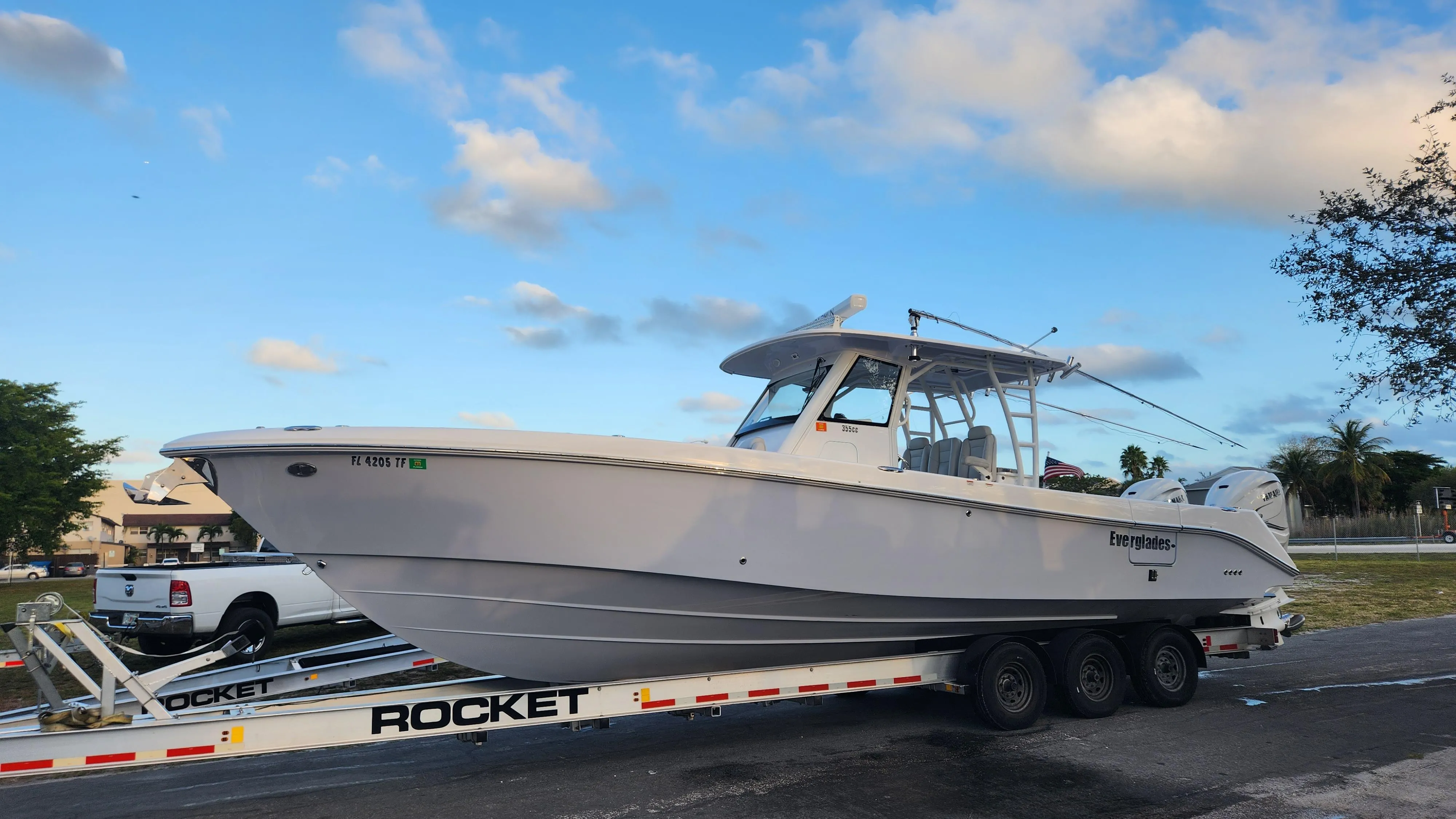 Introducing the 2019 Everglades 355CC with twin Yamaha V8 5.6L 425HP XTO Offshore engines, this boat is still under warranty and stands in excellent condition. Loaded with features, it boasts the advanced Yamaha Helm Master EX system, autopilot, and joystick for precise control. The vessel comes equipped with twin Garmin Touch Screen GPS, Garmin VHF, and a Fusion Stereo System with an amplifier and subwoofer for an enhanced audio experience. Other notable features include underwater lights, an electric table, a forward sunshade for added comfort, and a sleek gray hull color without bottom paint. The boat also comes with practical additions such as LED light bars, outriggers, and a full lightweight cover for protection. With its powerful engines and a range of high-quality amenities, this Everglades boat offers a comprehensive and enjoyable boating experience.