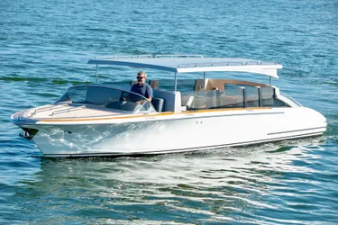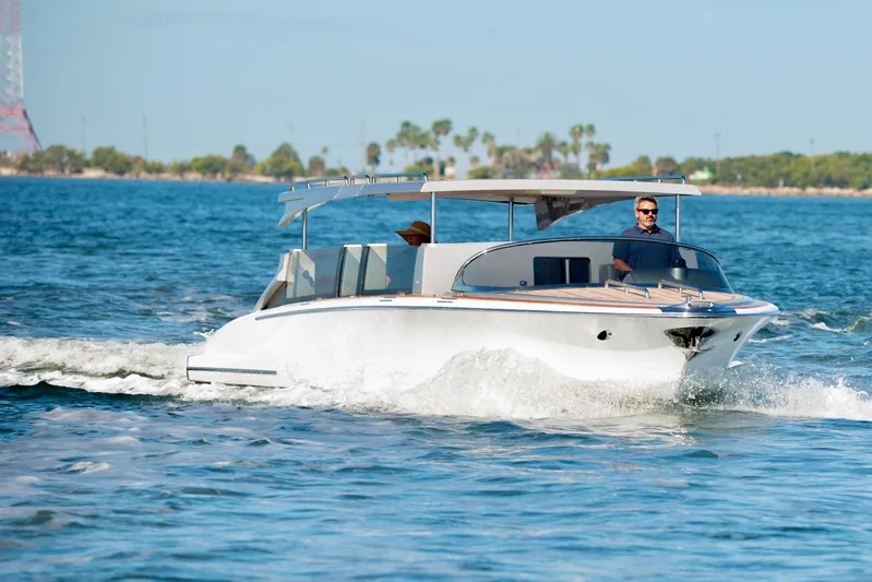 Built to the highest standards by Hodgdon Yachts in Maine. She seats 11 guests in luxury with a 360-degree view when the hardtop is raised, equipped with a high-definition entertainment system, refrigerator, bar, and climate control. She exceeds speeds of 30 knots, offers sports car-like handling that is Rolls-Royce-esque, smooth, and quiet. The hull was designed by Michael Peters and the custom interior by Hodgdon Yachts.