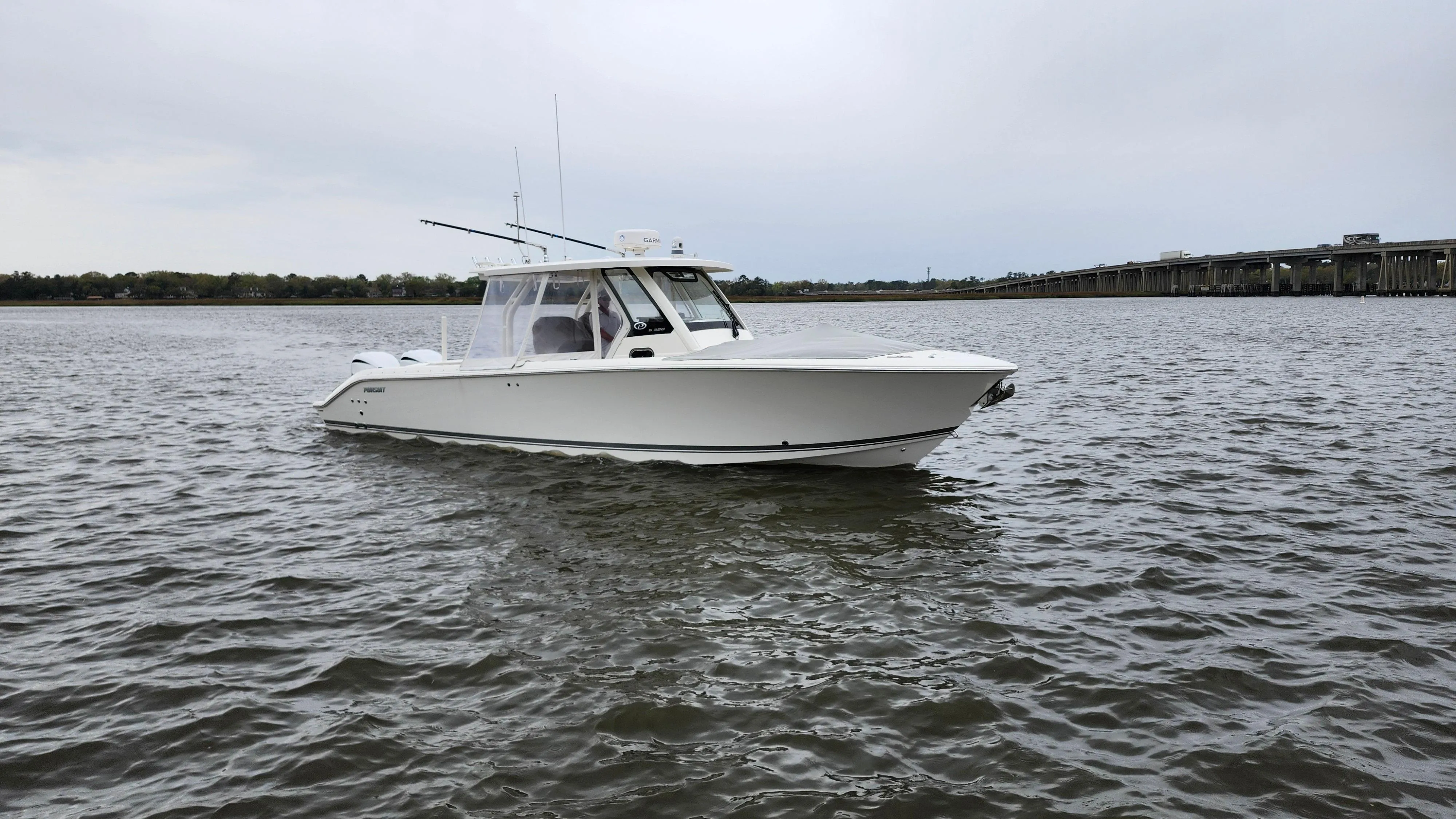 The Pursuit S 328 broadens the range of the Pursuit’s popular Sport Series. The athletic 32 features an oversized fiberglass integrated hardtop and windshield system, updated classic sheerline, through-stem anchor system and integrated transom extensions. The exterior styling is complimented by a forward wrap-around lounge at the bow, just opposite of the forward facing seating in the console.