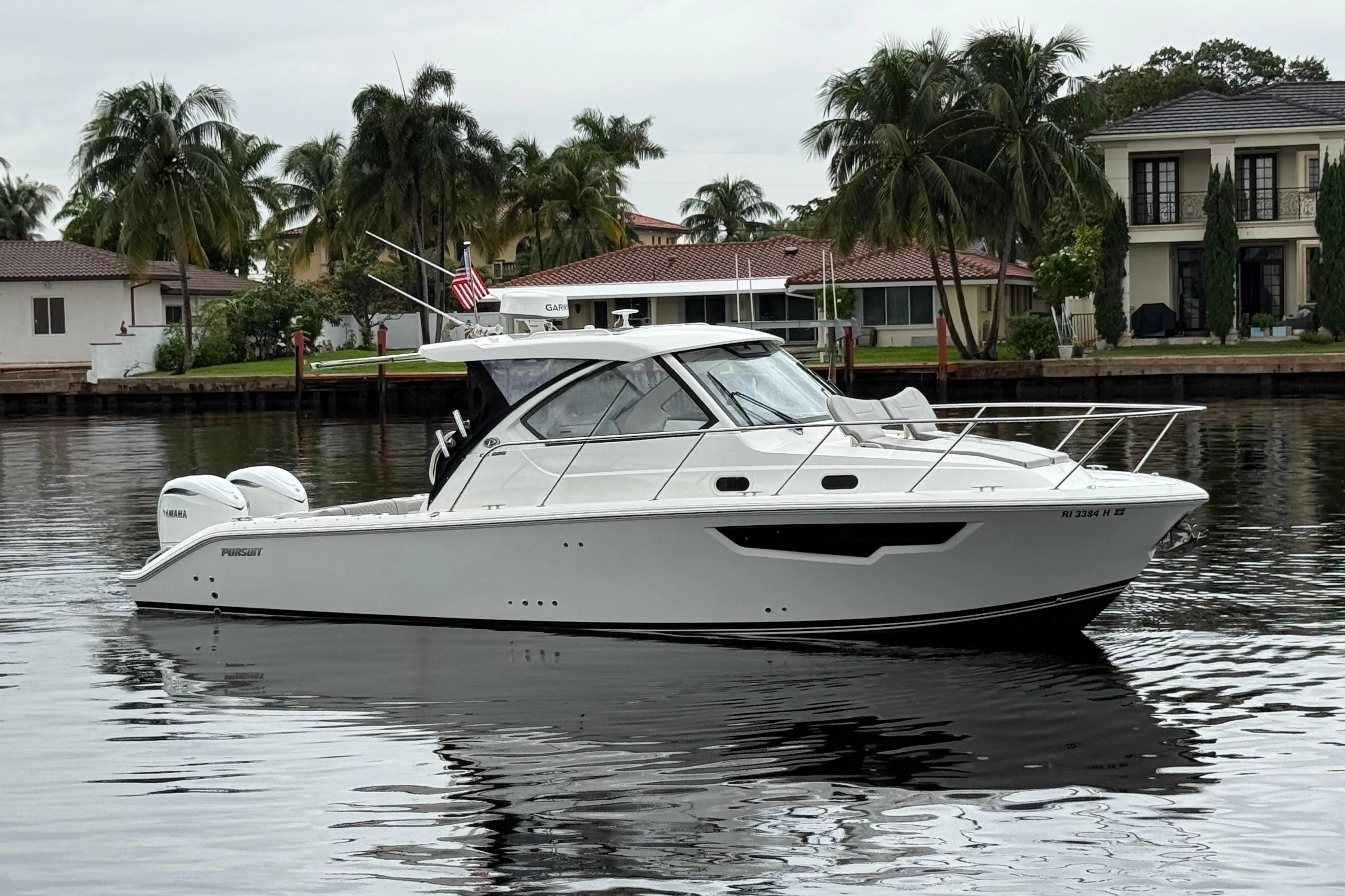The redesigned Pursuit OS 325 combines the power of twin Yamaha 350s, delivering speeds over 52 mph. A sleek, full-width hardtop and large, clear glass windshield front the bridge deck, where an L-shaped lounge wraps the helm with a foldout backrest and adjustable step for perfect visibility and comfort.