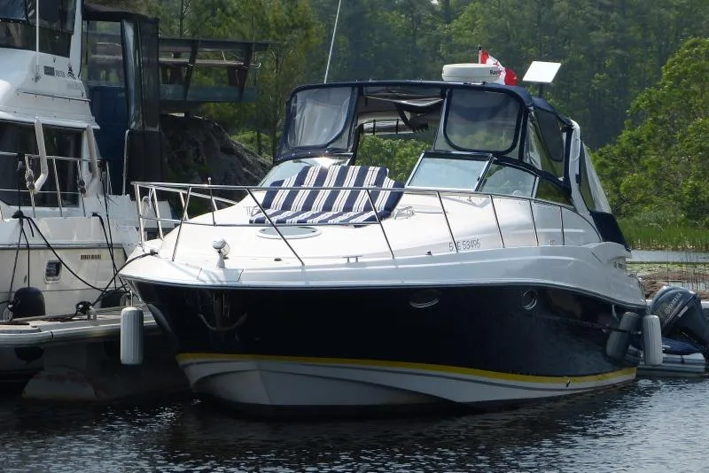 Cockpit: U-shaped seating forward with table & filler cushion converts to sun lounge, aft fold-away bench, double-wide helm seat with flip-up bolster, wet bar with combination fridge/ice maker, electric powered forward lifting engine hatch, secondary access engine hatch, radar arch with overhead lighting, snap-in carpet vinyl weave carpet, generous molded steps to walk-through windshield, removable cooler with dedicated storage compartment, full canvas enclosure, walk-through windshield, foredeck double chaise lounge/sunpad with cover