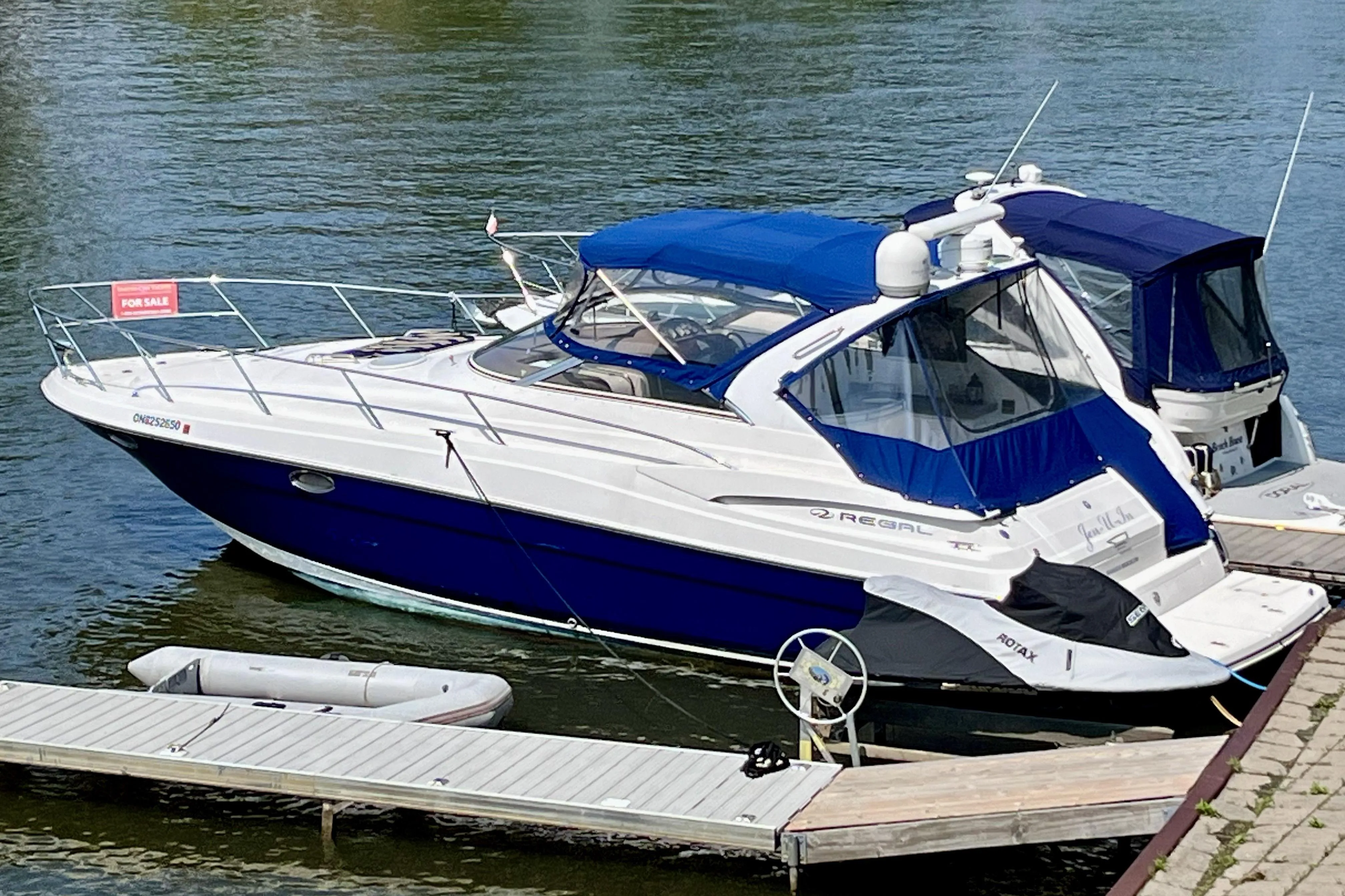 This 2005 Regal 3560 Commodore is powered by twin MerCruiser 8.1L big blocks producing 750HP combined with approximately 1125 hours. Highlights include a Kohler generator with a custom silencing module, air conditioning/heat, full canvas camper enclosure, Raymarine radar and C80 chartplotter, cockpit refrigeration, windlass, and a versatile two-cabin layout with a private forward stateroom and midcabin double berth plus a full head with separate shower and skylight.
