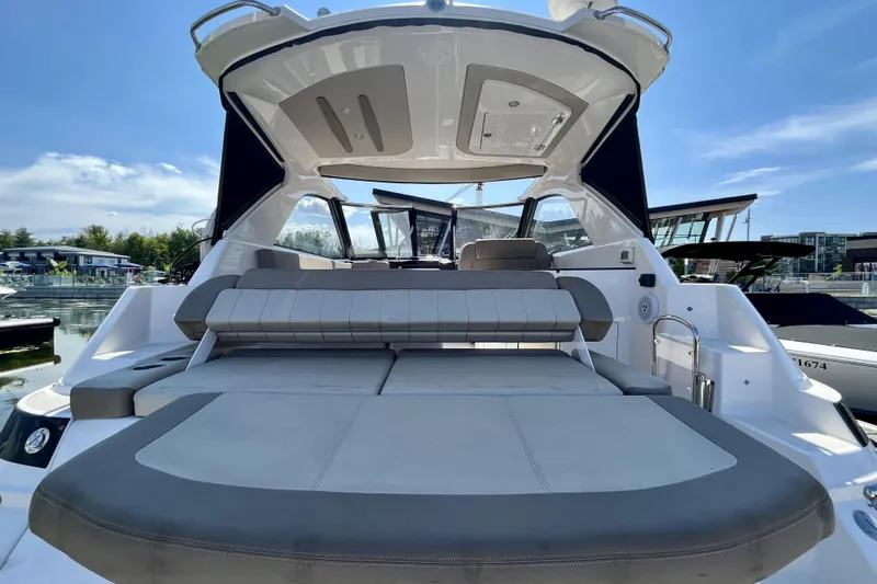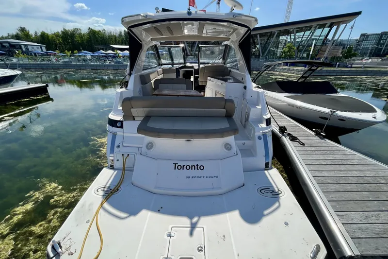 The Regal 35 Sport Coupe stands out for its single-level cockpit design, walk-through windshield access, versatile UltraLounge seating, refreshment centre, and bright open-concept cabin. Accommodations are well suited for comfortable weekends aboard with a forward berth, convertible mid-cabin sleeping area, full galley, enclosed head, and the convenience of generator-supported climate control.