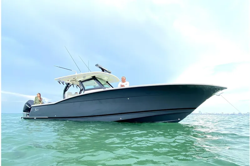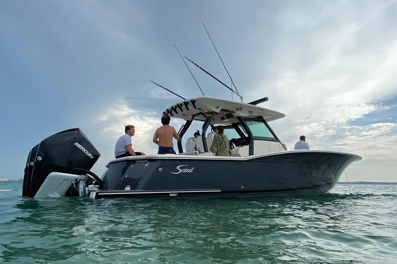 Our 355 LXF Shark Gray & Midnight Edition Package showcases unmatched performance power with triple Mercury Verado 300 HP JPO with only 420 Ours, with our Scout Dual Stepped Hull Technology, and utilization of Epoxy-Infusion for unmatched strength and stability. But high performance is just one attribute of this incredible model. The deck was designed to accommodate an optional Seakeeper 3DC gyro stabilizer just under the aft-facing bench seat, and for protection from the elements, just engage the optional electric fiberglass cockpit Sun Shade. Other notable innovations on this model include standard independent heated seats at the helm, a standard integrated forward-facing fish eye bow camera allowing you to see what’s going on in front of you via the helm touch screen displays, and solar panels that provide a trickle charge to AGM batteries when the Seakeeper 3DC is ordered for a longer battery life. And that’s just above deck. Just wait until you step down into the cabin and find all the luxurious appointments, headroom and attention to detail this beauty provides. boat is like new.