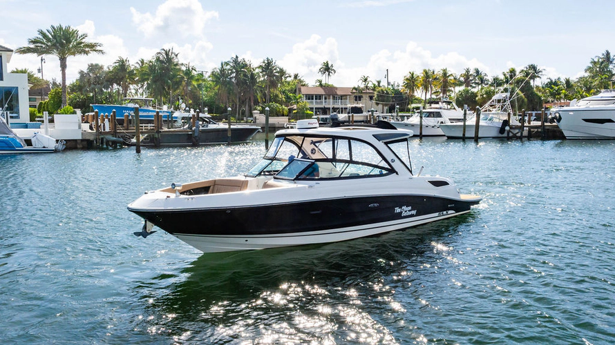 With low hours and light use, the boat is in excellent shape. Engines were serviced in March 2026, and all maintenance has been kept current with no outstanding issues. Full SeaDek flooring throughout enhances comfort, grip, and a clean, modern appearance. The fiberglass hardtop includes an aft extending sunshade for added cockpit coverage.