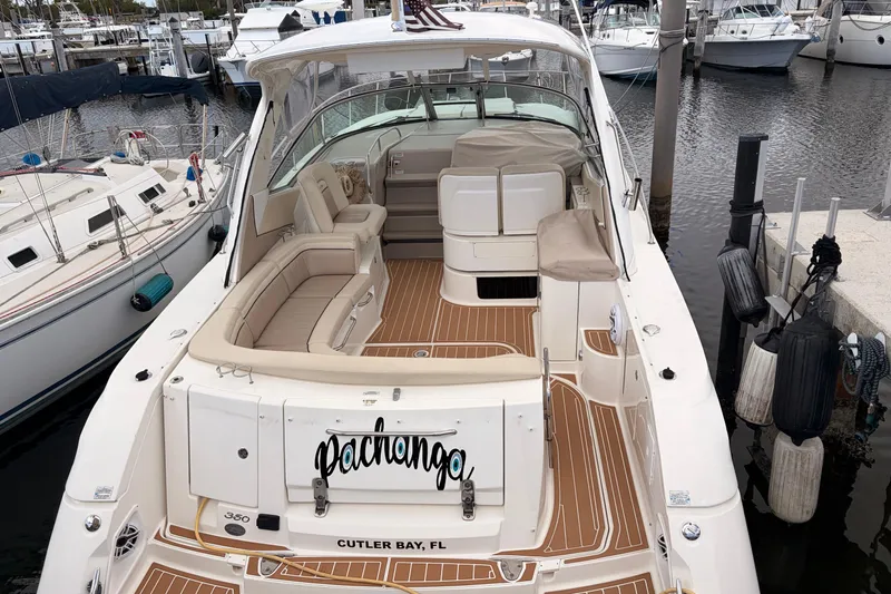 With her seamless hardtop, large hull windows, and sweeping sheer the Sea Ray 350 Sundancer (called the 370 Sundancer beginning in 2010) strikes the right balance of innovative design and next-generation styling. She's built on a deep-V hull with cored hullsides and a solid fiberglass bottom. The especially lush accommodations are a match for the most expensive European sports yachts. With 6'7" of cabin headroom and a huge mid-stateroom, the interior is that of a considerably larger boat. The comfortable cockpit can seat a small crowd and includes a deluxe wet bar with a refrigerator, teak cockpit table, power engine-room hatch, and a clever aft-facing transom seat that folds out of the lazarette and overlooks the swim platform. The swivel helm and companion seats are a nice touch.