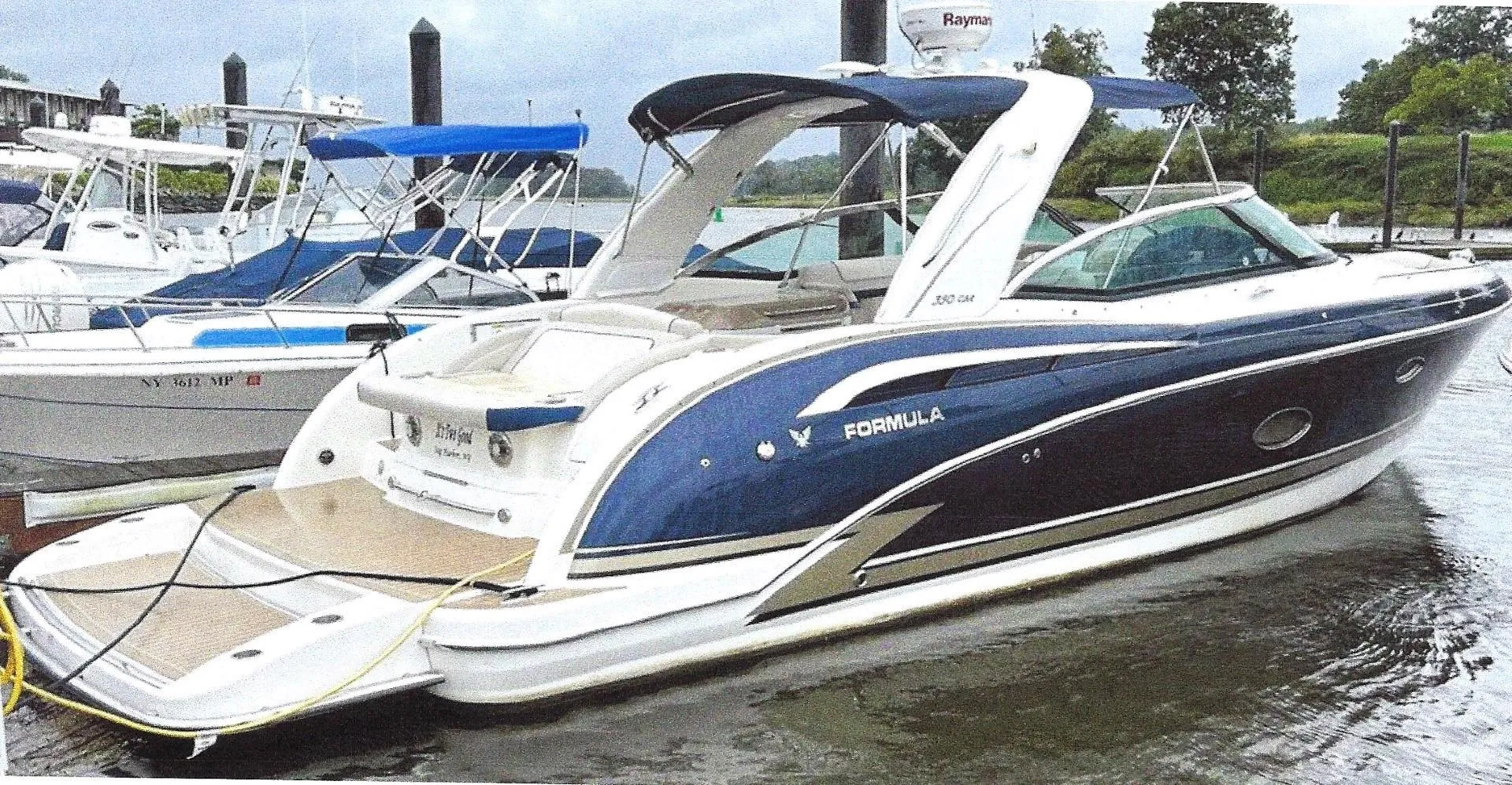 Great family fun boat with low hours on the twin MerCruiser 8.2L with a speed up to 50 mph! The boat has many features including Generator, Radar, GPS, VHF, Windlass, Clarion stereo, Frig. in the cockpit with sink and cooler, In the salon frig. and microwave, Head has vacu-flush and much more!!!