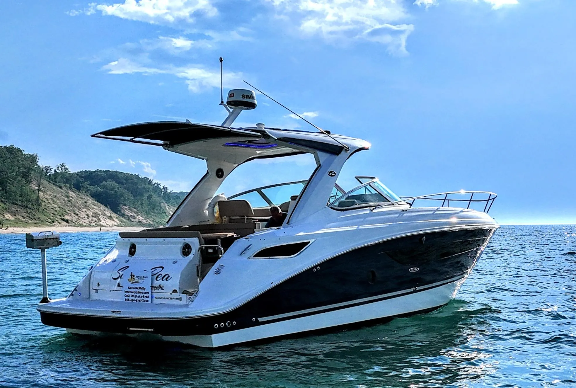Advanced Helm: Equipped with SIMRAD Radar and chart plotter, autopilot, VHF radio, hailer, depth sounder, speed gauge, hour meter, and remote spotlight for confident navigation.