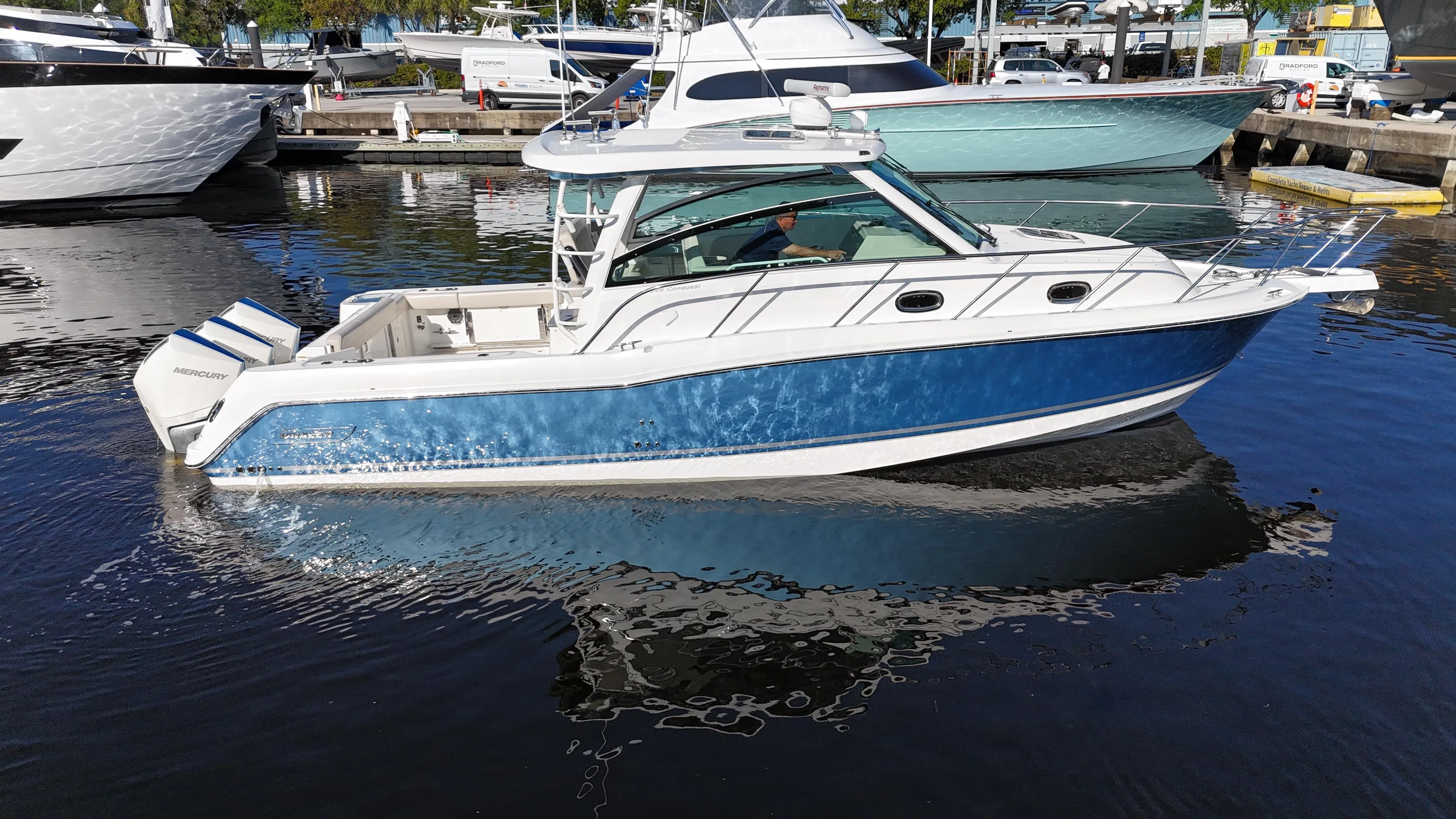 This incredible 345 Conquest has been full refitted to "better than new" condition!! No expense was spared! Custom paint and so much more. She has to be seen to be appreciated! She is kept in an indoor climate controlled environment. No bottom paint and ready for her new owner!!