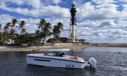For propulsion she has twin Mercury outboards (300-400hp) with joystick control and skyhook.