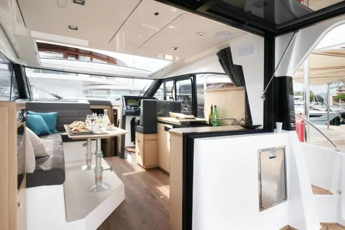 Inside, you’ll find two well-appointed cabins, a full-size bathroom with separate shower, and a bright main deck with large seating, a fully equipped galley, and panoramic glass for natural light. A glass sliding roof plus a retractable canvas skylight open the boat up to the sea breeze, while practical features like a helm side door and topside boarding door enhance usability in any marina.