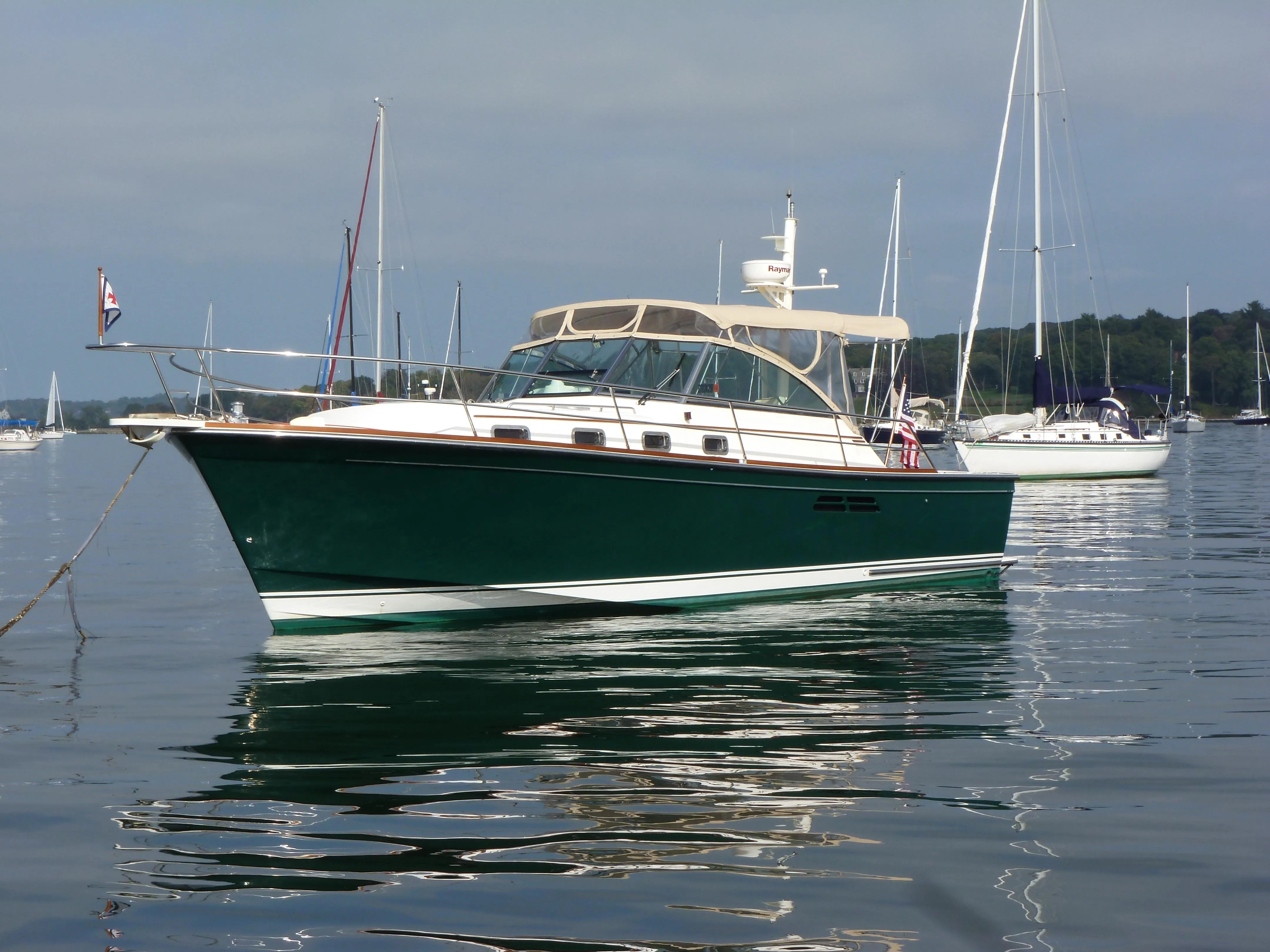 The dark green Awlgrip hull, tan nonskid, topped off with a custom-designed canvas top, all make the profile of this 36 one of the nicest we have ever seen.