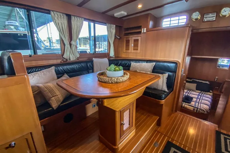 The Selene 36 has a large gourmet galley with abundant storage, an island master berth, a separate master shower and a spacious guest stateroom with a large V- berth forward. Her interior is elegantly finished in solid teak joinery with polished jade granite counter surfaces and Grohe stainless steel fixtures. On the outside, the Selene 36 has a graceful hull sheer and salty cabin lines due to her forward raked wheelhouse windows; a design feature commonly found on commercial vessels.