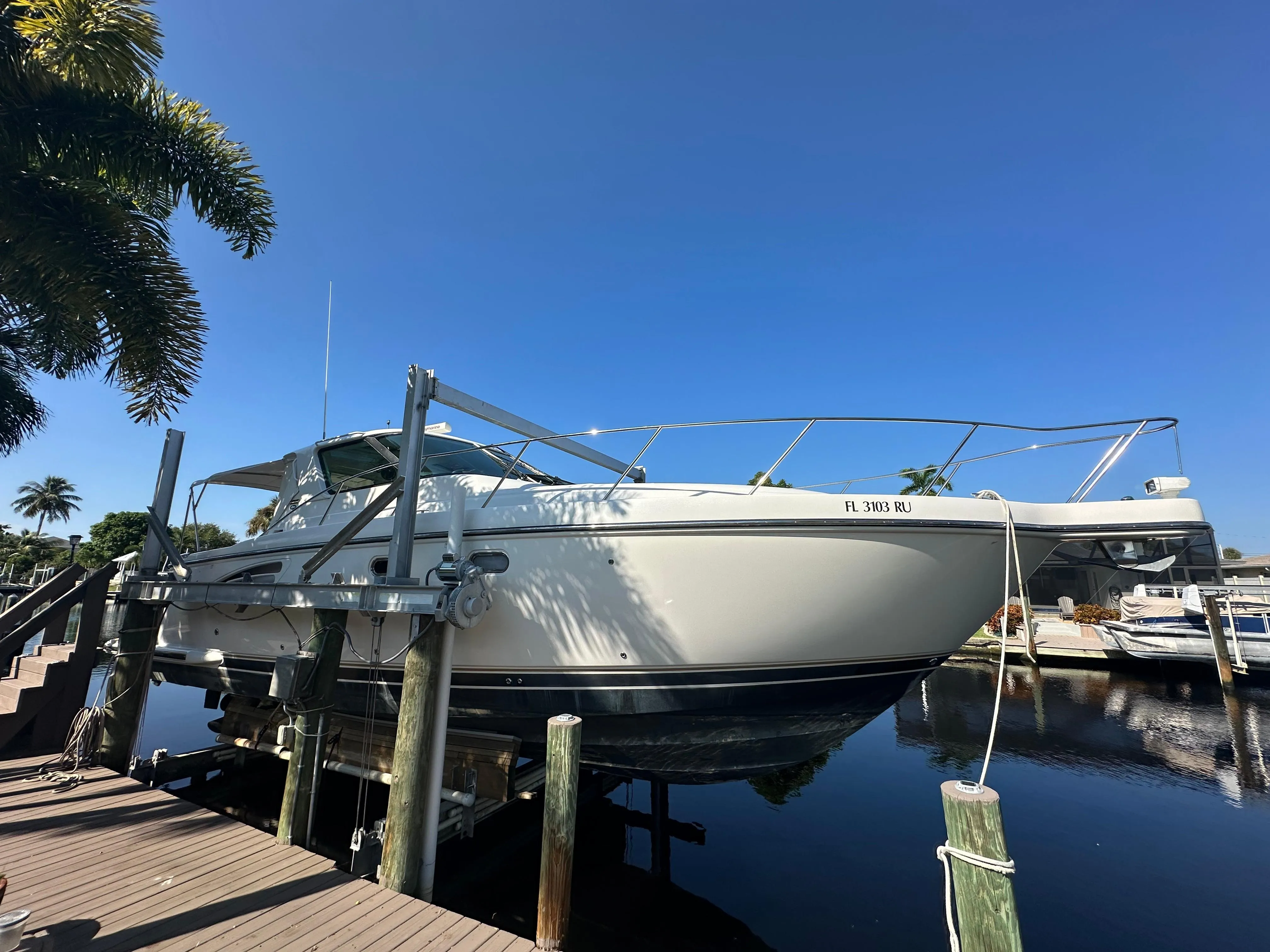 This Cummins diesel powered Sovran has been very well loved and been taken care of to great levels. Owner purposefully sourced out a fresh water boat when the purchased it roughly 4 years ago. She originated in Michigan and shows as fresh water vessel. Boat has been lift kept for entirety of it's FL life. Low hours (500), newer enclosure as well with aft curtains and covers for all seats and aft cockpit. Sovran's are one of the toughest builds that Tiara made. Very solid ride combined with enclosed climate controlled cockpit and helm area which gives basically an extension to the salon. Boat shows great.