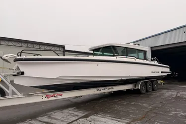 A boat that checks all the boxes- The 37 Cross Cabin is the perfect all around boat that combines the functionality of both indoor and outdoor entertaining spaces all while feeling like a large center console with a fully enclosed and weatherproof cabin. This boat features two cabins- One forward with a head and sink and one large berth aft. In the salon there are two sliding doors along with a sunroof which is wonderful for the nicer weather days, but can be completely enclosed within seconds. Plus with the twin step hull design and sharp entry the ride is nothing short of impressive!