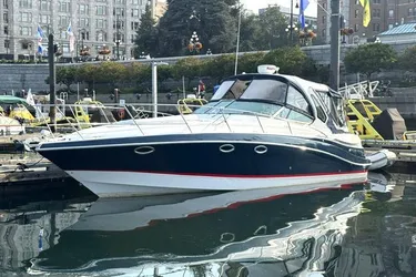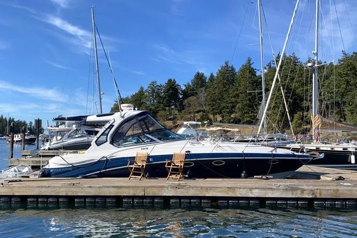 Sporty and luxurious, this Four Winns V375 has always been dry kept - no corrosion, and shows BRISTOL! Only 374 hours on twin Volvo PENTA 320 mains with sparkling clean Duo Prop outdrives and stainless props; she's easy to drive with joysitck docking; offering 25-40 mph, hold onto your hats! Be ready to enjoy your on-deck time with Magma grilling station and flip down 'rumble seat' on the expansive swim platform, plus transom underwater lighting. Full nav electronics, CruiseAir heat & A/C, Vacuflush, Kohler genset with only 41 hours, inflatable tender with electric outboard & Weaver davit, the list goes on!