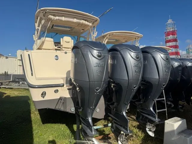 This immaculate, 1 owner, 2021 Grady-White 370 Express was just traded for a new Grady. This boat was sold new by our marina and serviced with us ever since. The triple Yamaha F300XSB outboards have only 353 hours and feature Yamaha's new all-electric Integrated Digital Electric Steering which pairs very well with the latest Yamaha Helm Master EX Joystick control. Other options and upgrades include: Bow thruster, Autopilot, Fisher Panda Diesel Generator (With 406.7 hours), Helm & Cabin AC, Crank adjust outriggers, Cockpit side bench seat, Forward deck lounge, Fold down TV in hardtop, (2) Simrad NSS16 Evo3S 16 inch MFD's, SS164 1kw 50/200kHz thru hull transducer, RS40 VHF radio, & Fusion Subwoofer w/amplifier.