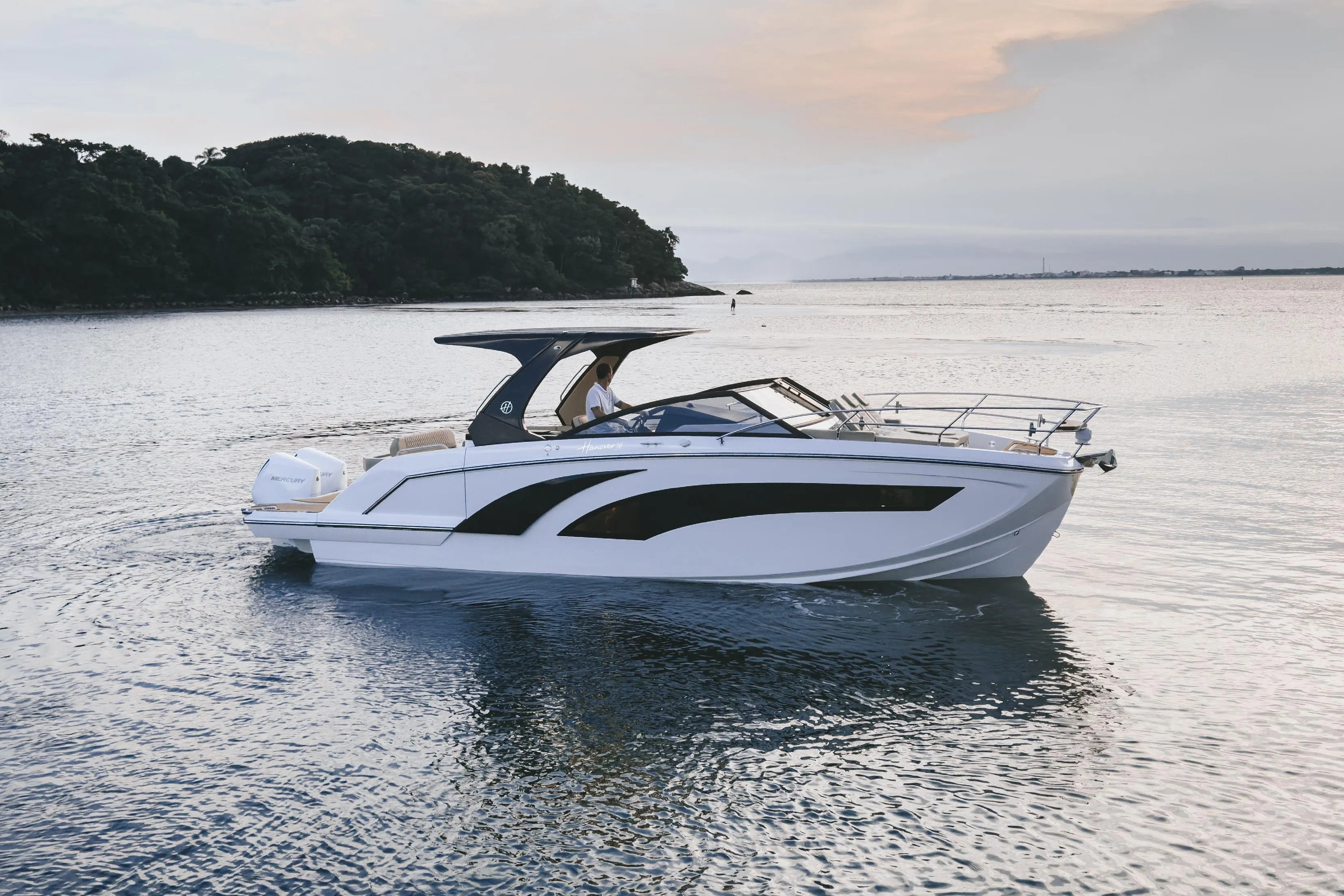 The 347 White & Black Edition pairs Hanover’s crisp two-tone exterior with a smart, weather-ready deck plan. Zip in the full eisenglass, deploy the electric aft shade or bow tent, and drop the Beach Club for water-level lounging, this layout flexes from run to raft-up in seconds. EVA flooring ties the cockpit, stern and bow together with grippy comfort underfoot, while the Kenyon grill and cockpit fridge keep service smooth dockside or at anchor.