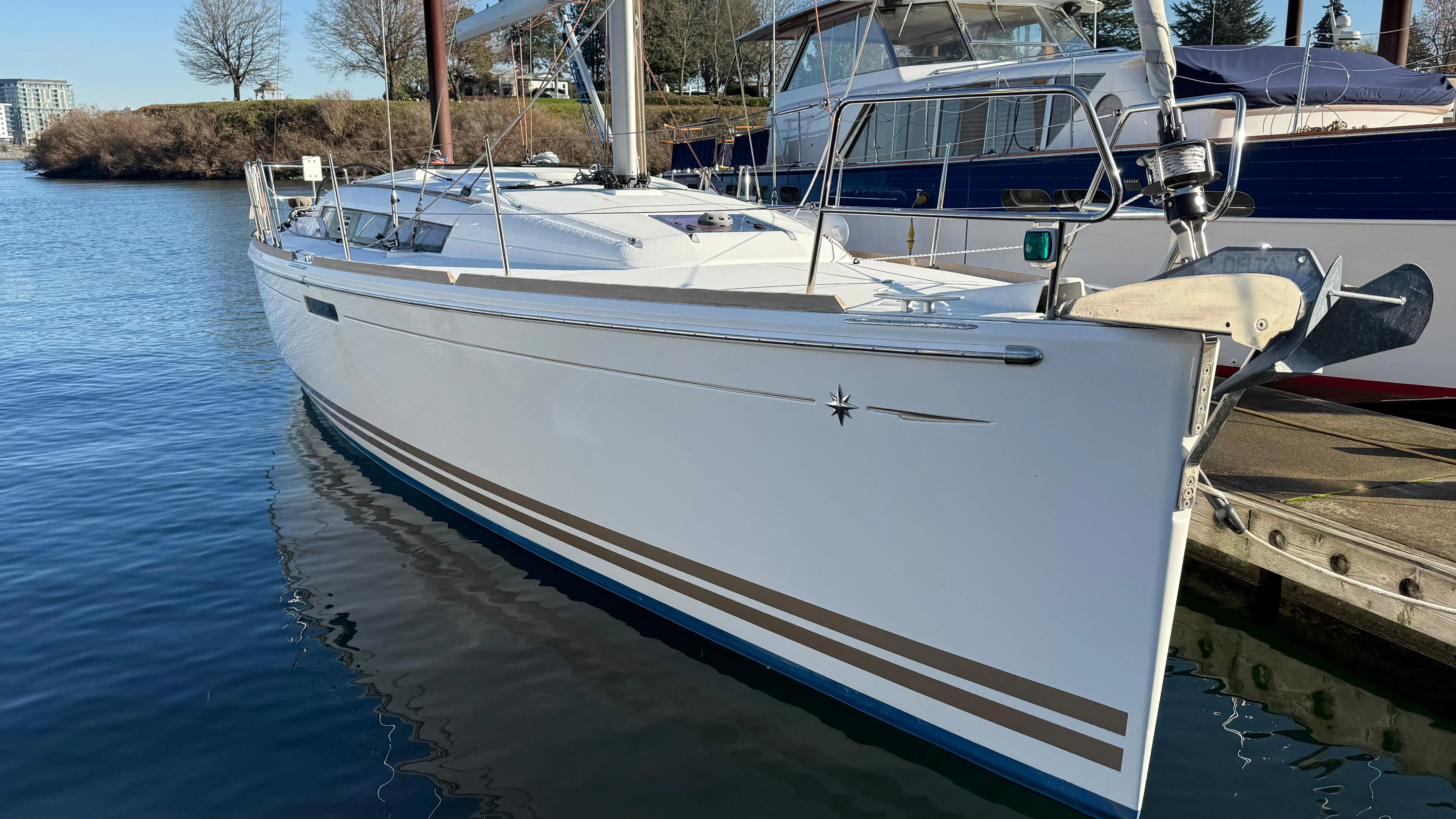 The year that it was introduced, the Jeanneau Sun Odyssey 379 was named Domestic Boat of the Year and Best Midsize Cruiser by Cruising World Magazine. With the Sun Odyssey 379, designer Marc Lombard created a boat that "sails exceedingly well with a smart, functional layout." Its chined hull design, and spacious cockpit, make the Jeanneau Sun Odyssey 379 is both comfortable and fun to sail. Highlights of the Jeanneau Sun Odyssey 379 include a retractable swim platform, main and jib sheeting near both helms for ease of trimming, comfortable main saloon with extra bunk in the settee, nice sized head with separate shower and access to a large stowage compartment aft of the head. Luna is a lovely and well maintained 2 cabin version of the Sun Odyssey 379. Her 6.4 ft keel, in-mast main, furling genoa, chart plotter visible from both helms, and full dodger make her a pleasure on both day sails and longer cruises.