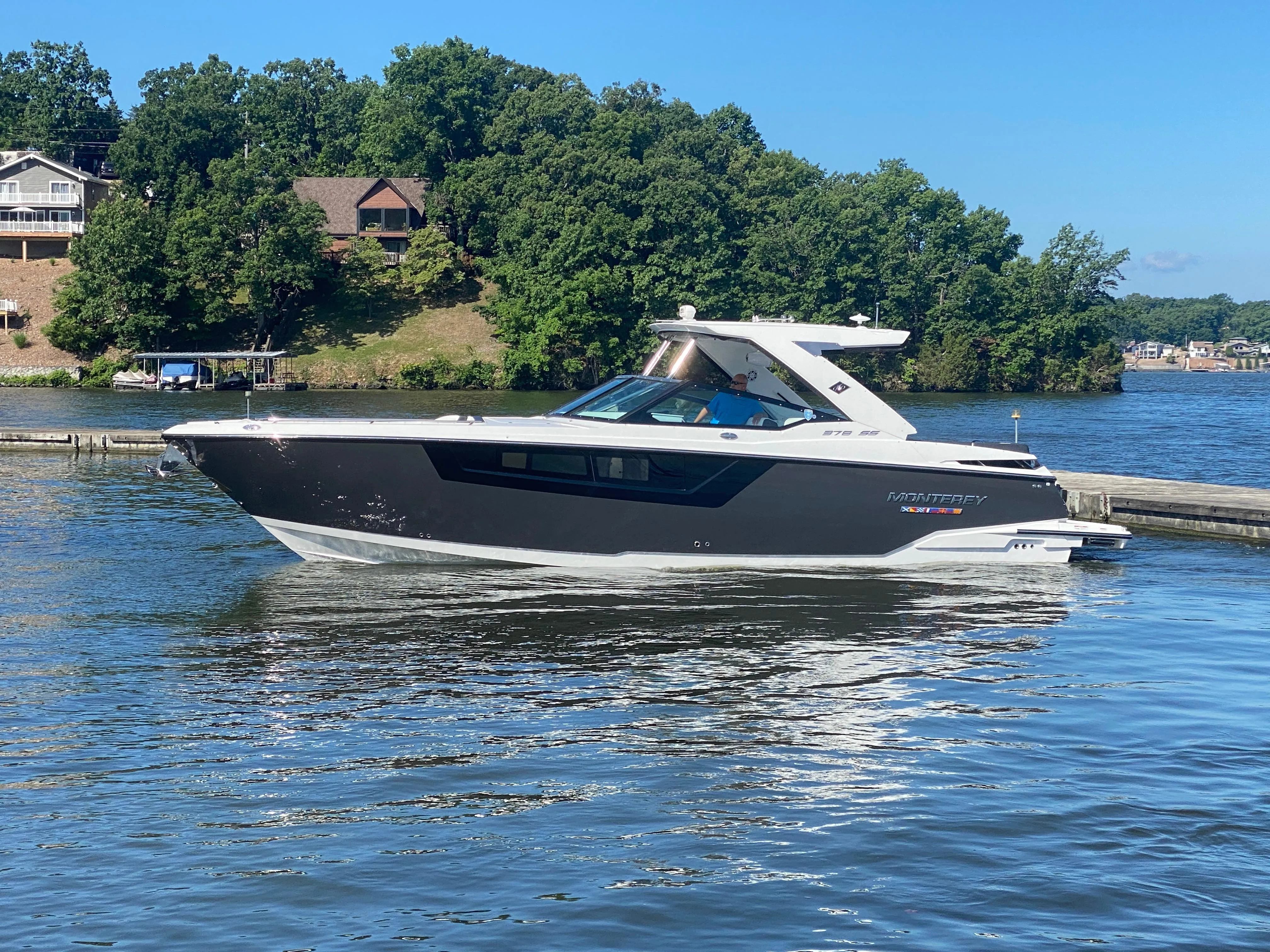 2022 Monterey 378SS, Twin Mercury 502 M AG HO (430HP - 100 fresh water hours - 52 mph), bravo 3 drives, trim Tabs w/ Indicators & Auto Retract. DTS Controls. Mercury Joystick Control. Seagrass cockpit flooring. RGB LED Underwater Lights. Low Emission 7.5KW Westerbeke EFI Generator. AC w/ Reverse Cycle Heat-16,000 BTU. Remote Spotlight. Dual Simrad NSS9 EVO3S Displays w/ Fusion Link. Mercury VesselView 903 Display. Simrad RS100 VHF Radio. Simrad SS60 Transducer. Cockpit Wet Bar w/ Fresh Water Sink & Fridge. Transom Shower. Premium Fusion Apollo Series Stereo w/ JL Speakers, Sub, Amps, Tower Speakers, Dash & Cockpit Remotes. Stern Mounted Stereo Remote. Mid-Cabin 22" LED TV. Cabin Fridge & Microwave. Enclosed Electric Head w/ Holding Tank, Indicator & Pump Out Deck Fitting. Pull Out Shower Head. Isinglass Cockpit Enclosure. Boat includes BPPC Engine/Captain's Class Accy/Gen and wear upgrade transferable for a $50 fee good until 03/2030.