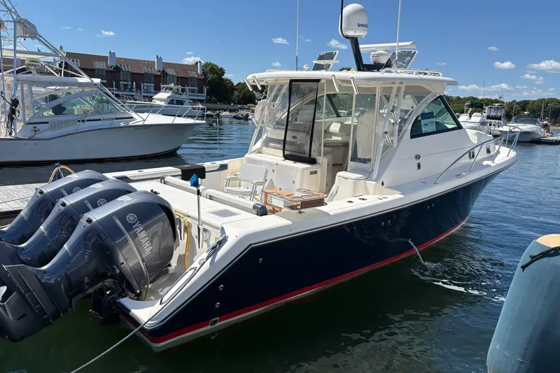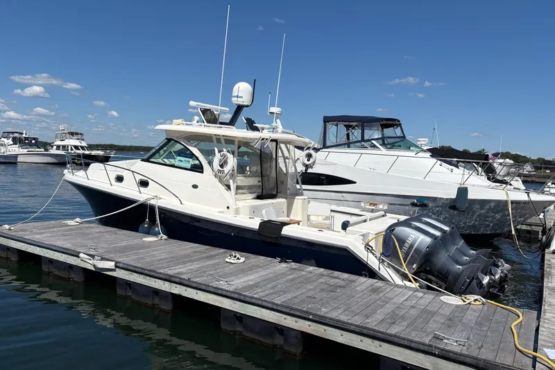 The 375 combines the performance, seaworthiness and fishability of the world's top inboard battlewagons with the luxuriousness of the most comfortable cruisers. Its sleek express-style design features an enormous 13-foot beam which results in an expansive cockpit and roomy accommodations below decks. Every inch of this boat exudes yacht quality fit and finish, from its beefy grab rails, to its bow thruster, to its Corian-countered gourmet kitchen,complete with a two-burner glass stovetop, microwave, 7.5 cubic-foot stainless steel refrigerator/freezer and stainless steel polished sink with hot and cold pressurized water. Also below decks, light-colored interior accents and strategically located ports make the interior spacious and inviting. Opposite the galley, the curved dinette seats you and your guests for a comfortable dinner at the custom teak table with a telescoping pedestal. The head compartment features an enclosed head/shower area separate of the vanity area so that the wet area is contained requiring minimal clean up after a nice hot shower at the end of a long day. You'll also find ample storage and even a towel bar, clever touches by people who obviously know how precious space is to boaters. Amidships you'll find a double berth that can actually accommodate adults, complete with a convenient settee with sitting headroom and reading lights. The forward berth provides additional space with a pull out drawer to maximize the sleeping area when it's needed and optimize interior space when not in use. A lighted hanging locker, below berth storage drawers and compartments allow you to tuck away clothing and accessories for immediate and easy access.If you've been yearning for yacht-like performance and features, without the constant maintenance and expense, the 375 OS is the answer to your dreams.