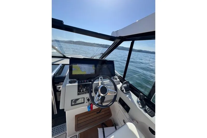 Salon & HelmInside, Regal’s upscale finish work is immediately apparent: hardwood cabinetry, solid surface counters, and designer flooring create a warm, modern interior. Oversized hull-side windows bring in excellent natural light, while the electric sunroof opens the salon up when you want fresh air. Comfort stays consistent with salon A/C and reverse-cycle heat.
