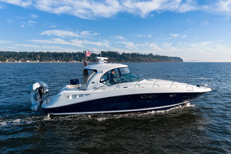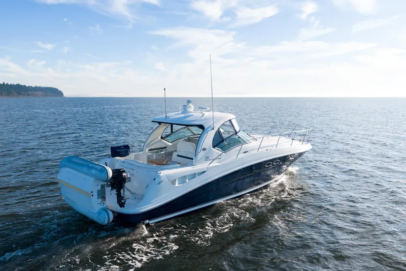Exceptional cruiser powered by twin MerCruiser 8.1S engines with 900 hours. With strong performance and an excellent family layout, this Sea Ray 390 offers spacious accommodations (including private master with access to enclosed head), updated canvas, and desirable features like a bow thruster and SeaWise davit system. Capable of 23 knot cruise and 30 knot top speed, she is equally suited for entertaining, cruising, or overnight stays for the whole family.