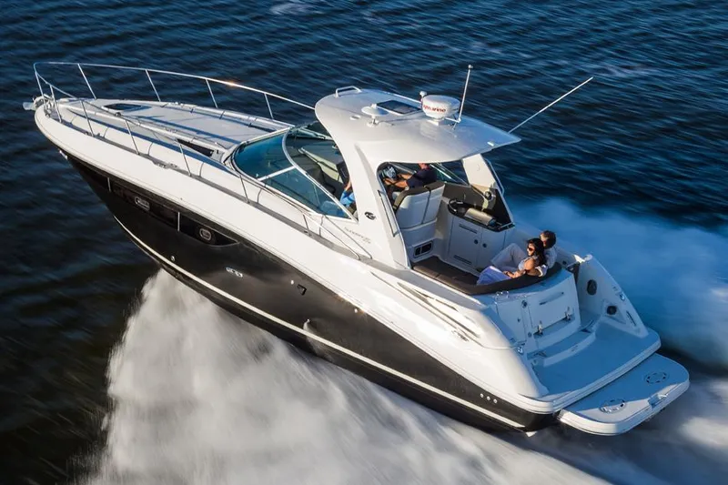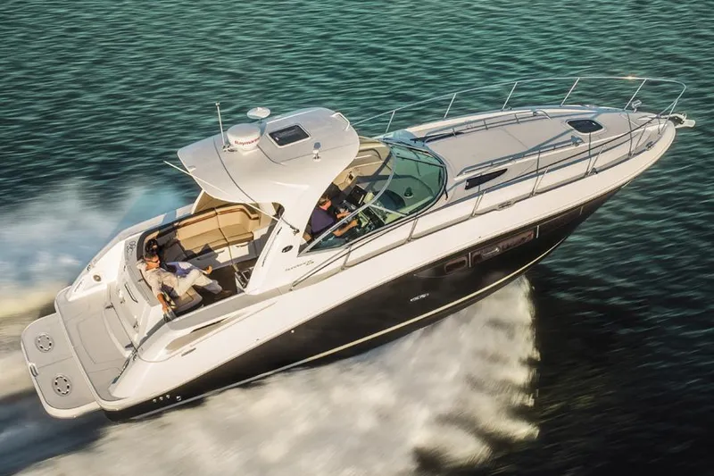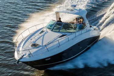 The generous dimensions of our 370 Sundancer make it exceptionally adept at cruising and entertaining, and an extensive list of sterndrives or inboards, gas or diesel, lets you choose your preferred power. A roomy interior with island V-berth, mid-berth (or optional private stateroom) and convertible salon sofa can sleep six. Plus, there is a full galley and head, and a flatscreen TV with remote DVD player.