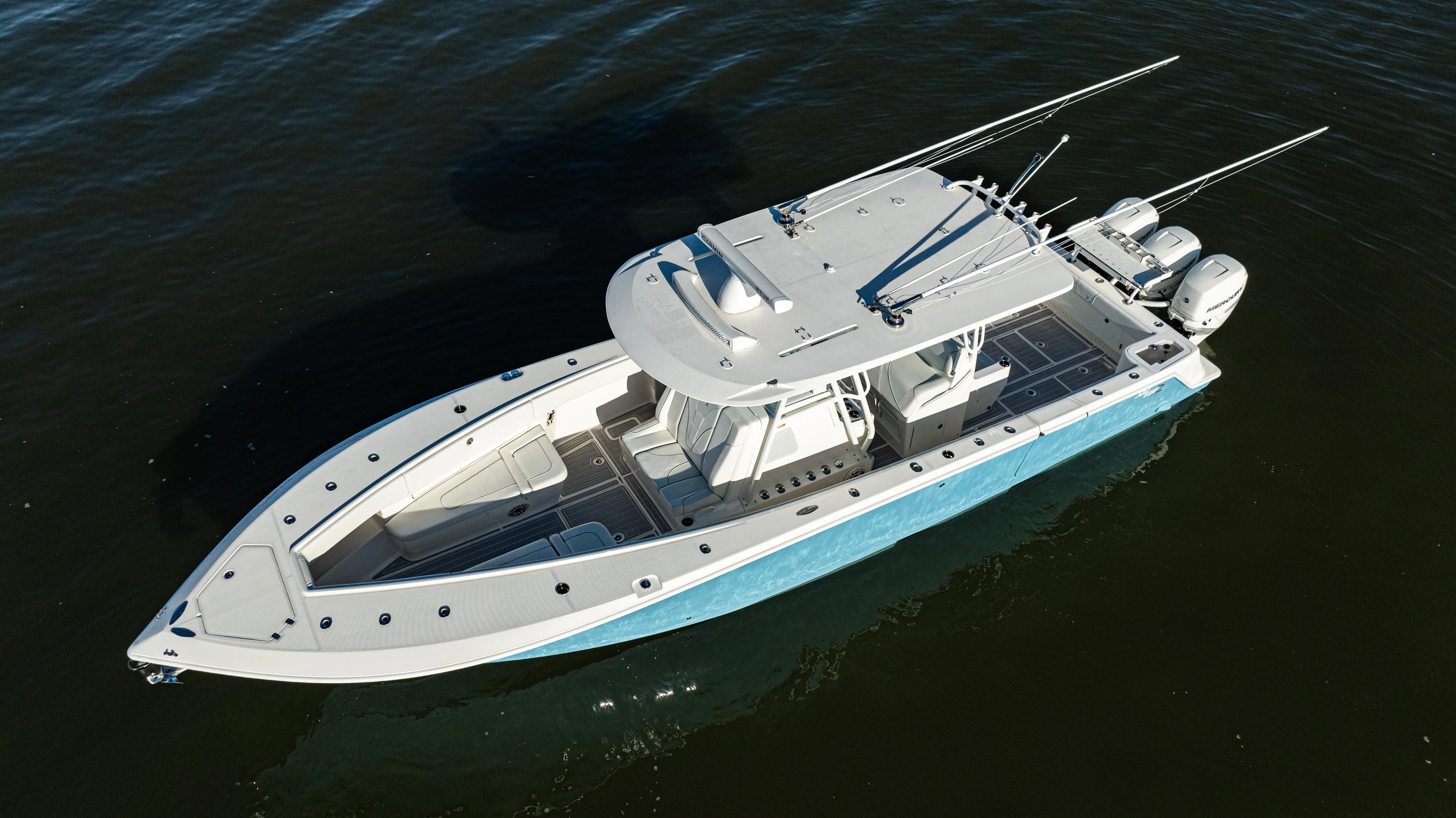 2020 3702 Stepped Hull Open Fisherman powered by triple Mercury Verado 350hp outboards with factory-painted warm white fusion engines and custom hull color!