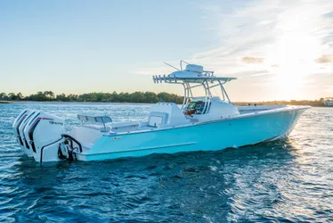 This Tribute 37 is a high-performance, custom-built center console fishing boat known for its patented stepped hull design, offering a dry, fast, and stable ride for an achievable top speed in excess of 78 mph. Featuring premium Garmin electronics, extensive fishing amenities (livewells, fish boxes, rod holders), and a focus on superior fit and finish with advanced materials. Key specs include a 37'6" LOA, 10'2" beam, 365-gallon fuel capacity, and a robust construction using epoxy-infused glass/Kevlar/carbon.