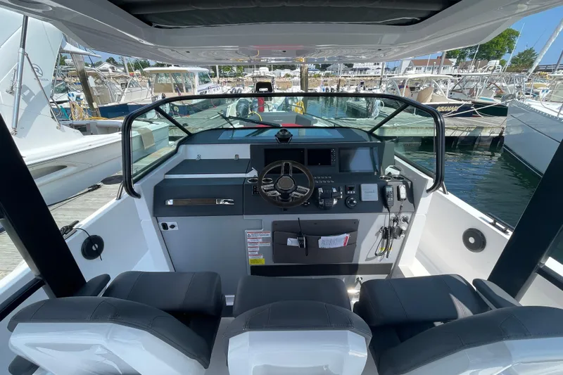 This 2020 Axopar Brabus Edition 37 Sun Top comes equipped with a helm station that includes Dual Garmin 12” Displays, Garmin radar, VHF, Fusion entertainment system, bow thruster, Twin Mercury 350 Verados with a five-year warranty, Brabus package, underwater light, LED lights, refrigerator, waterski frame, anchor hatch cushion, toilet compartment, and upholstery with storage. Lockable access hatch to the front cabin with grab rail in leather, Sliding door to the front cabin in dark grey soft-touch finish, Cup holder on the dashboard, Splash-proof USB outlet in console wall, Document pocket on console wall, and a footrest in stainless steel and support. Excellent Condition.