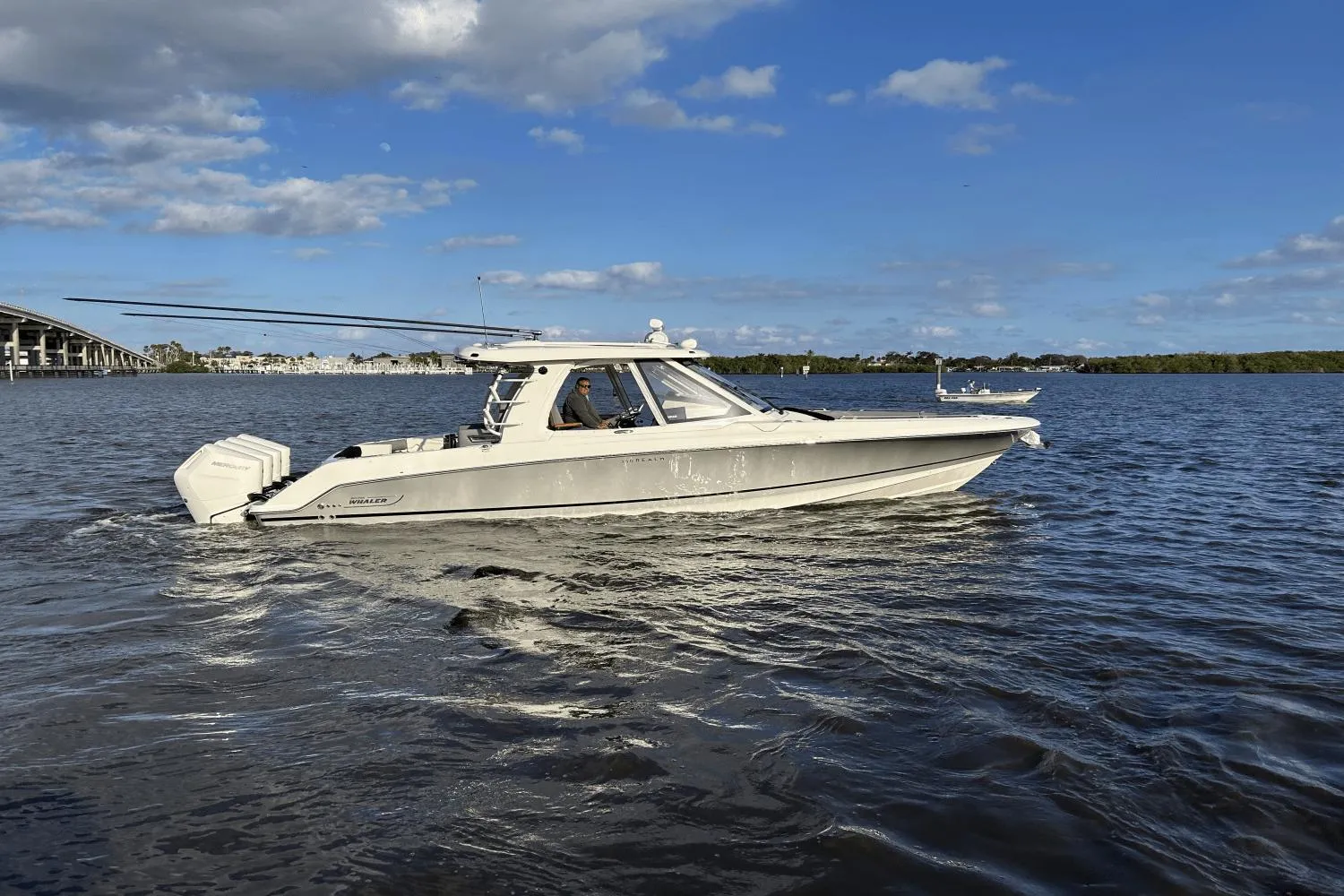INTRODUCING 2024 BOSTON WHALER 380 REALM - This vessel is in like new condition. A rare chance to find a lightly used 380 Realm with every option. The diesel Panda generator has less than 10 hours of run time, carbon fiber outriggers, black graphics, chrome Whaler logo, tidal gray upholstery, Platinum hull color, Platinum underneath hardtop color, black canvas, white frame, QUAD 400 V10 Joystick AMS Verado power, bow lounge with backrest and fold down armrests with drink holders (5), deluxe port side helm deck seat with armrests (adjustable slide and swivel enabling rotation of the seat inboard), foldout stern bench seat with elevated backrest, bow wrap around seating with drink holders (4) , full height forward bolster and removable cushions, deluxe swivel 2-person helm seat with armrests (adjustable electric slide and 180-degree rotation creating opposed seating conversation and dining area, helm deck second row seating, prep center equipped with storage drawers, solid surgace counter top at prep center, molded in fiberglass sink at prep center, stainless steel grab rail at prep center, 120 volt outlet at prep center, stainless steel refrigerator at prep center, 5 gallon trash can at prep center, cast stainless steel thru hulls, bonding system for underwater through hull fittings, bilge pumps (automatic), battery charging system mulit stage, advanced battery management system (remote electric switches with automatic and pushbutton paralleling, 445 gallon aluminum fuel tank, reverse cycle heat and ac in cabin, reverse cycle heat and ac in helm area, high water alarm, all through hulls have sea cock shut offs, Simrad 16 " NSS Evo 3 S displays (3) undermounted in black acrylic dash panel, Simrad VHF, Chirp sounder, structure scan, AIS, spotlight, winshield wipers, JL audio sound system with subwoofer and loads of speakers creating an unbelievable sound, LED lighting throughout, tempered side glass, enclosed head area with shower and sump pump, full coaming bolsters, dive ladder with large tread steps, central vacum, separate JL audio for cabin area, the list is very extensive on this one of a kind opportunity!