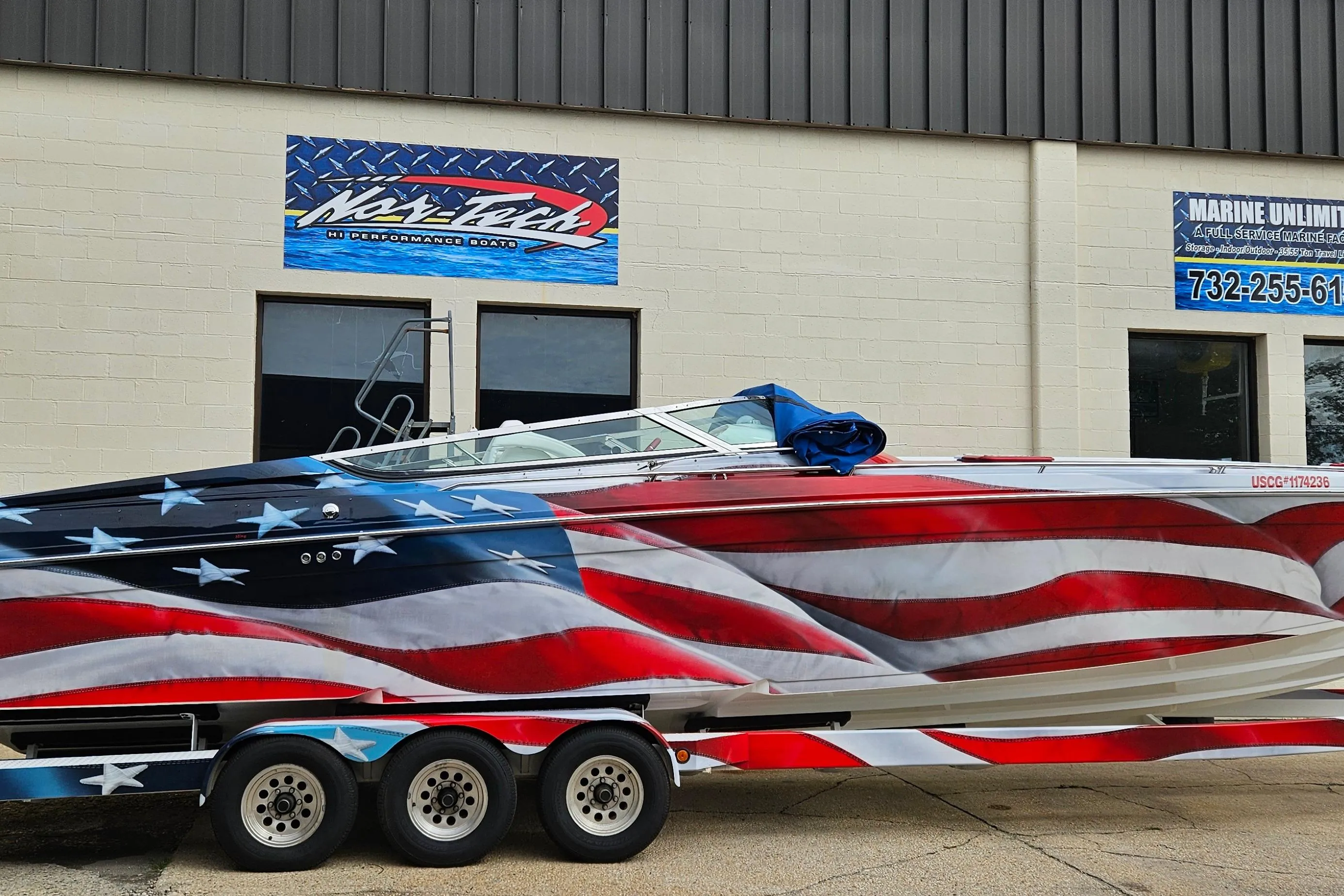 The boat was sent to the legendary TAOD paint shop where Dean Loucks applied an absolutely stunning American flag paint job, with such incredible detail that it looks like it was stitched onto the boat.  There are over 10,000 individual stitches painted on each side of the boat, and the detail on the individual stars looks like they are embroidered.  And they didn’t stop at the chine of the boat with the graphics.  The Prestige trailer continues the stars and stripes theme as well.  This paint-job is truly breath-taking!