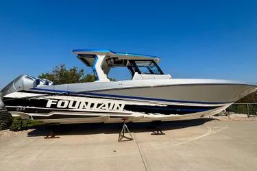 Triple custom-painted Mercury 5.7L V10 400 Verados, black engine package, DTS controls, bow thruster, hydraulic trim tabs, custom paint and graphics, paint-matched console, dash, and helm seat base, gloss black powder coating, white Alpha cool touch upholstery with light gray cool touch quilted panels, blue Pacific Diamante accents and piping, blue lightning bolt stitching and embroidered logos, Slate Gray/Aegean Blue Fountain pattern marine mat flooring, windlass/anchor rode kit with thru hull striker plate, polished stainless plow, 15' of 5/16" galvanized chain, 150' of 5/8" 8-strand braided rope, Reverso automatic engine flushing system, Fischer Panda 5KW diesel generator, Shadow-Caster RGB LED cockpit/underwater lighting control system, Nite Track night vision camera, SeaKeeper 3 gyrostabilizer, Garmin 50W Fantom dome radar, Garmin full function hydraulic autopilot, dual Garmin GPSmap 8617 17" multifunction displays, Garmin GPSmap 8612 aft hardtop display, VesselView 903 engine monitoring display, Garmin 215 AIS VHF radio and antenna, Fusion RA770 touchscreen entertainment center with built-in WiFi, JL Audio system with (15) 7.7" RGB speakers, (4) 8.8" RGB coaxial speakers, (6) 6.5" RGB coaxial speakers, (2) 12" RGB subs, (2) 10" RGB subs, (3) 800W 8-channel amps, (1) 600W 6-channel amp, (1) 1000W mono block amp, black stitched leather-wrapped steering wheel, windshield wiper, electric SureShade, forward cockpit sailshade, starboard side cockpit dive door with ladder, enclosed head with ceramic toilet, overboard discharge and freshwater holding tank, freshwater sink and shower, convertible bed/couch, freshwater and raw water washdowns, transom shower, battery charging system, dash and helm seat covers.