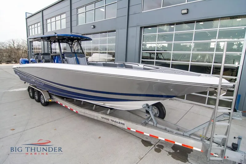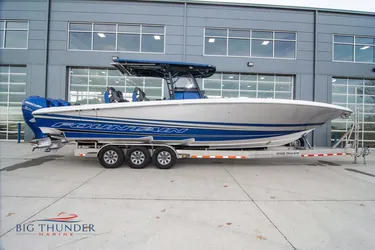 2022 Fountain 38 SC Triple Custom Painted Mercury 400M Verado’s (210 fresh water hours - 75+mph - Merc platinum engine warranty until 04/30/2027), 380 K Plane hydraulic trim tabs, Custom ceramic coated paint & graphics with matched helm & hard top, Cool touch vinyl upholstery, Bow thruster, Electric SureShade, Thru hull striker plate windlass w/ polished ss anchor rode kit, 15’ of 5/16"" galvanized chain & 150’ of 5/8"" 8 strand braided rope, Starboard cockpit dive door w/ ladder, Double row helm stand up bolsters, Shadow-Caster RGB cockpit & underwater lighting control system, Garmin electronics pkg. (dual 16"" displays, Airmar B60 transducer, Vessel View engine monitoring system). Fusion touch screen entertainment center w/ built in wi-fi, Fusion stereo wireless remote, JL spkr. system w/ (6) 7.7 RGB spkrs, (4) 6.5 RGB spkrs, (2) 8.8 RGB spkrs., (4) 10"" RGB subs, (2) 600W 6 Ch amps & (2) 600W mono block amps, Color matched spkr. grills, Stitched sport leather steering wheel, Addtl. USB in dash, Screened center console port light, Transom shower, Fresh & raw water washdowns, Head w/ fresh+raw water holding tank & overboard discharge, Battery charging system. New trailer quotes available separate. Financing and delivery options also available, all 2016 and newer model year trades considered. 2019 Myco trailer pictured available for $24,000. New CTS trailer is also available for $36,000. Marine Concepts cover also available.