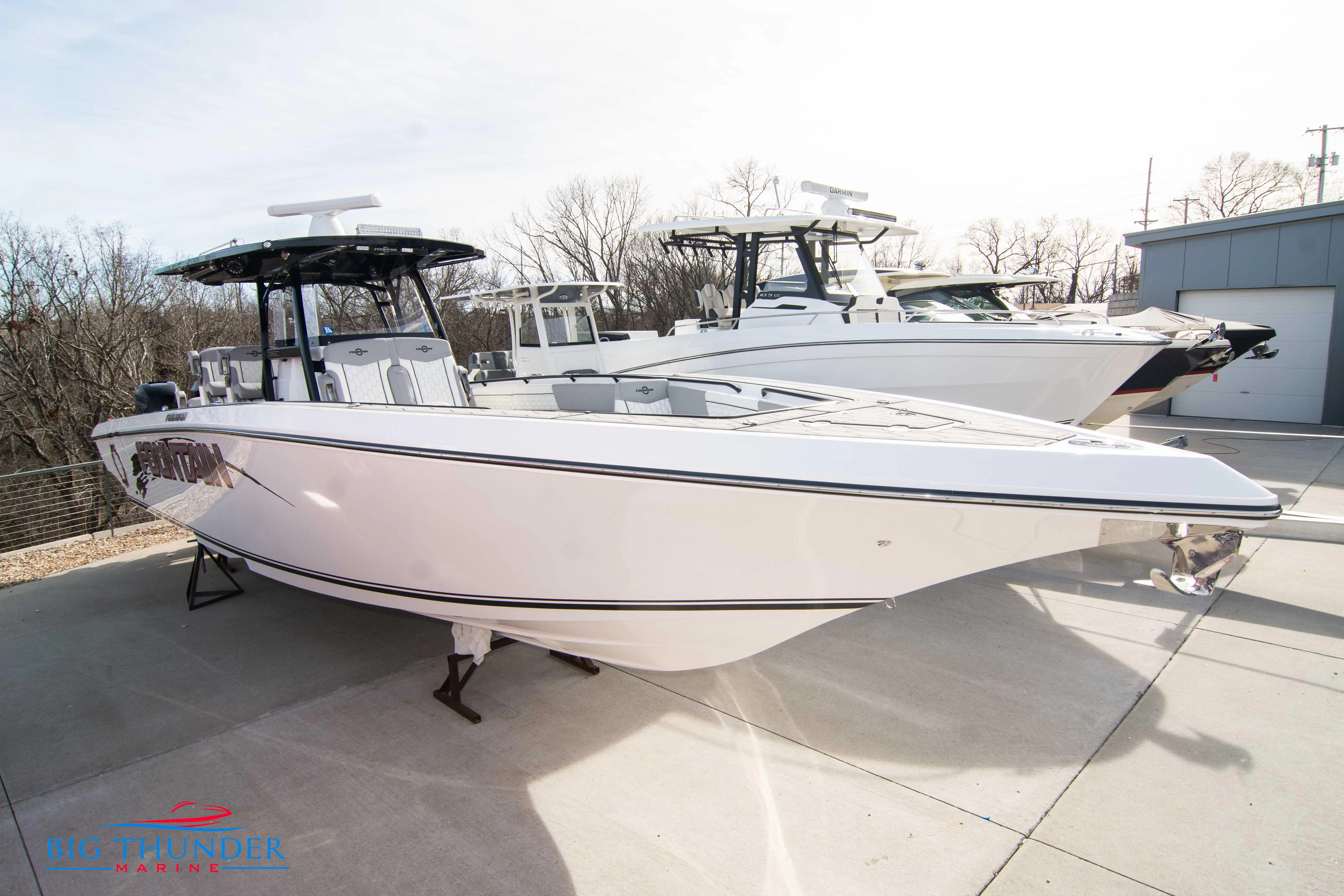 2022 Fountain 38 SC Triple Mercury Racing 400R Verado's (126 hours). DTS controls. Reverso automatic engine flushing system. 380 K-Plane hydraulic trim tabs. Bow thruster. Windlass/anchor rode kit w/ thru hull striker plate, polished SS plow, 15’ of 5/16" galvanized chain, 150’ of 5/8" 8-strand braided rope. Garmin full function hydraulic autopilot. Garmin GMR 525 xHD2 4’ open array radar. Garmin 215 AIS VHF & antenna. Dual Garmin GPSmap 8616 multi-function displays. Airmar B60 transducer. Simrad EVO3 NSS engine monitoring dispaly. Premium JL Audio system w/ Fusion touch screen entertainment center w/ built In WiFi, (2) 6.5" LED Spkrs., (8) 7.7" LED Spkrs., (2) 8.8" LED Spkrs., (4) 10" LED Subs, (2) 600W 6 Ch Amps & (2) 600W Mono Block Amps. Fusion wireless stereo remote. Starboard side cockpit dive door w/ ladder. Electric SureShade. FWD cockpit sailshade. Double row helm stand-up bolsters. SS steering wheel w/ "speed knob". Additional USB outlet in dash. Add’l. glovebox USB. Screened portlight.