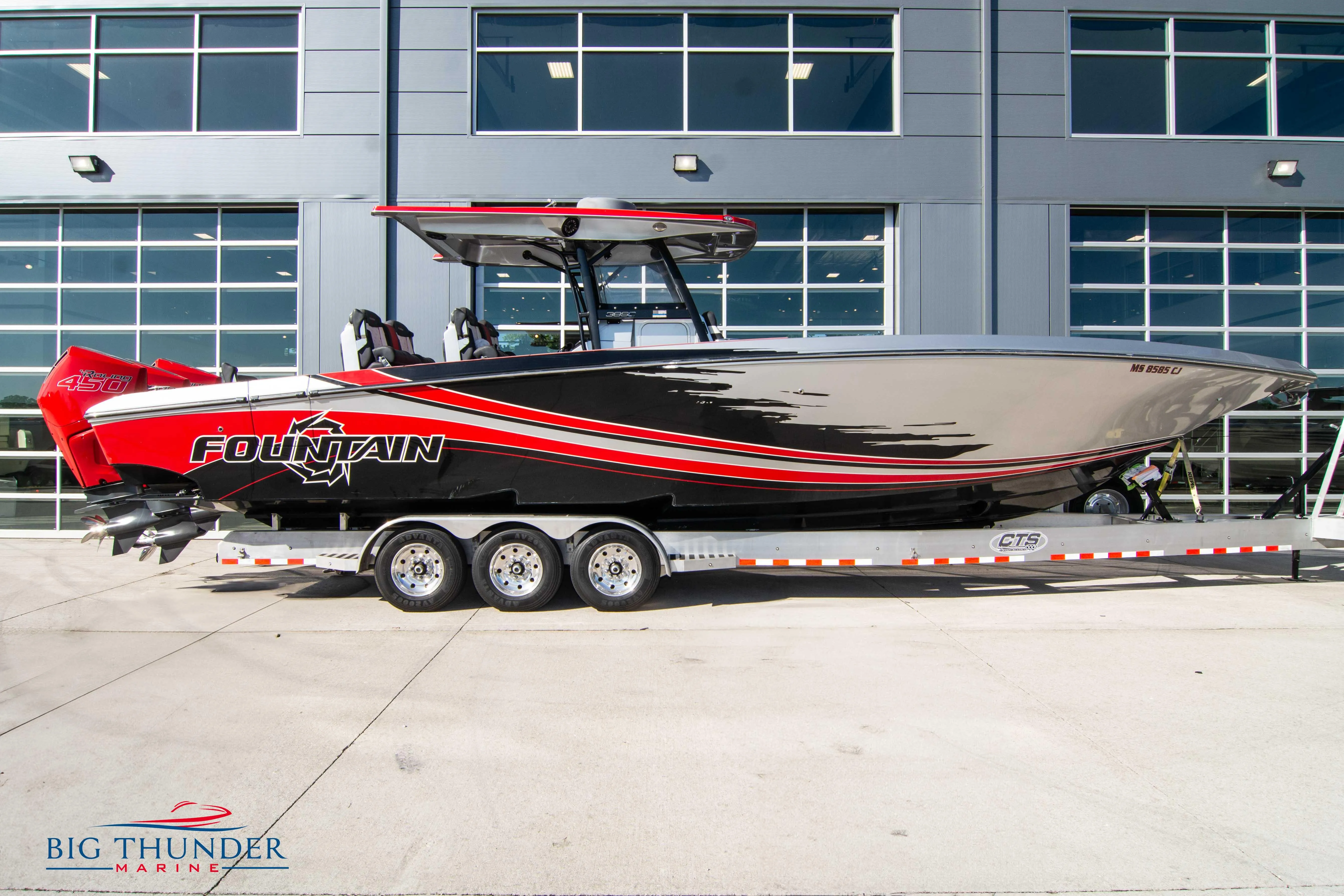 2021 Fountain 38 SC Triple Paint Matched Mercury Racing 450R Verado's (373 hours). Reverso Automatic Engine Flushing System. Custom Paint & Graphics w/ Matching Console, Helm, & T-Top. Hard Top SeaDek Insert. Livorsi 1150 Hydraulic Trim Tabs. Bow Thruster. Thru Hull Anchor Windlass/Rode Kit, Striker Plate, Polished SS Plow, 15’ of 5/16"" Galvanized Chain, 150’ of 5/8"" 8-Strand Braided Rope. Black Cool Touch Interior Vinyl Upholstery w/ White Alpah Quilted Panels, Bright Red Hitch Accents & Piping, White Hex Pattern Stitching & Dark Gray Embroidered Logos. Stitched Sport Leather Steering Wheel. Additional USB Outlet in Dash. Screened Portlight. Starboard Side Cockpit Dive Door w/ Ladder. Shadow-Caster RGB Cockpit & Underwater Lighting Control System. Garmin xHD 24" Dome Radar. Dual GPSMap 8616 16" Displays. Vessel View 903 Engine Monitoring Display. Garmin 215 AIS VHF w/ Antenna. Premium Audio System (Fusion Touchscreen Entertainment Center w/ Built In WiFi, (4) JL 6.5 LED Spkrs., (6) 7.7 LED Spkrs., (2) 8.8 LED Spkrs., (4) 10"" Subs, (2) 600W 6 Ch Amps & (2) 600W Mono Block Amps).  (2) Additional 7.7" Bow Speakers w/ Upgraded Amp. Wireless Stereo Remote. Double Row Stand Up Helm Bolsters w/ (2) Additional Subwoofers. Additional 20 Gal. Fresh Water Tank (30 Gal. Total)