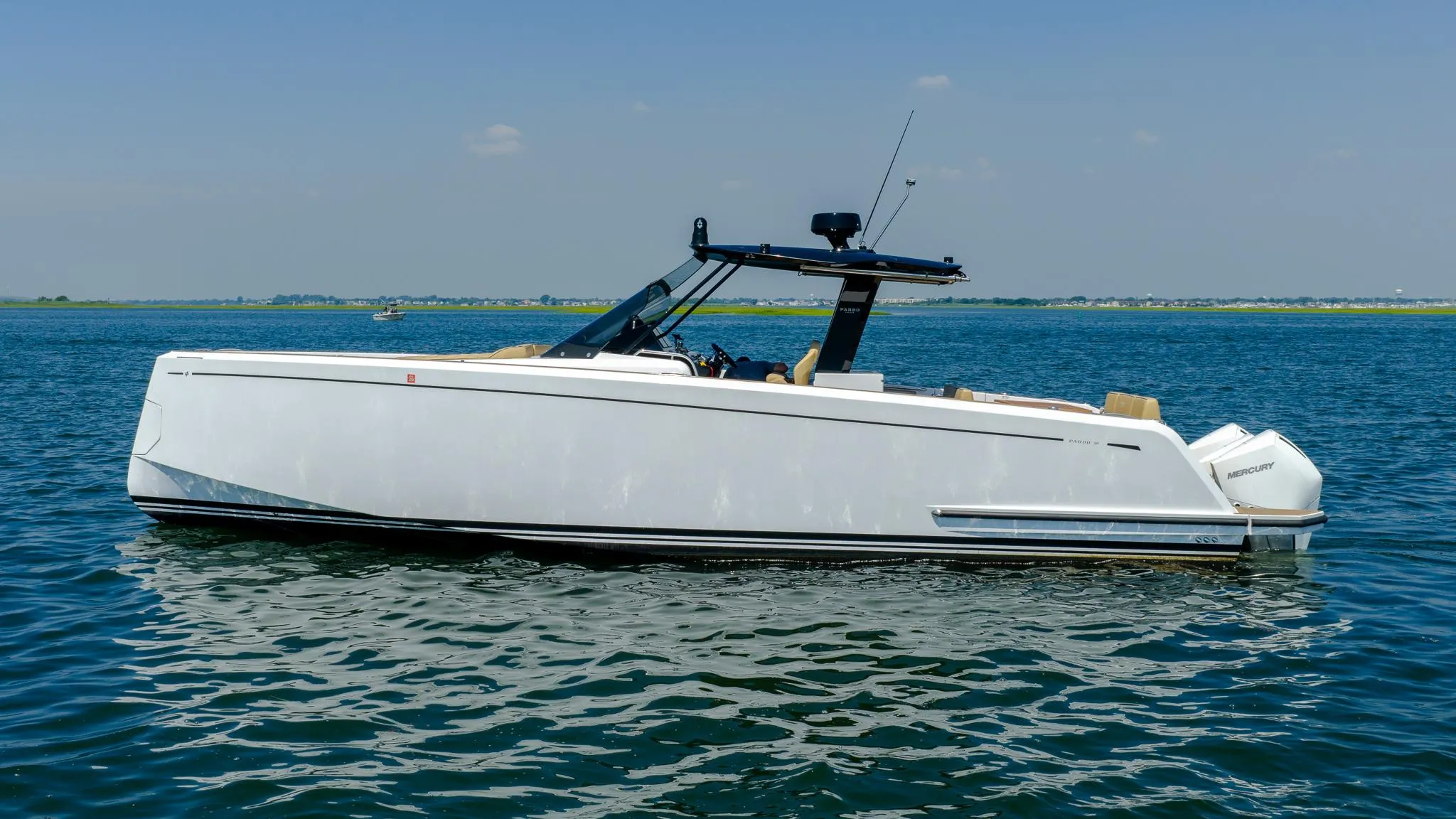 With many desirable options including FLIR, sureshade electric shade, stabilizer, and skyhook, this P38 will turn heads in any harbor she enters thanks to her striking carbon black T-top against her clean white hull and triple Mercury 300HP engines.