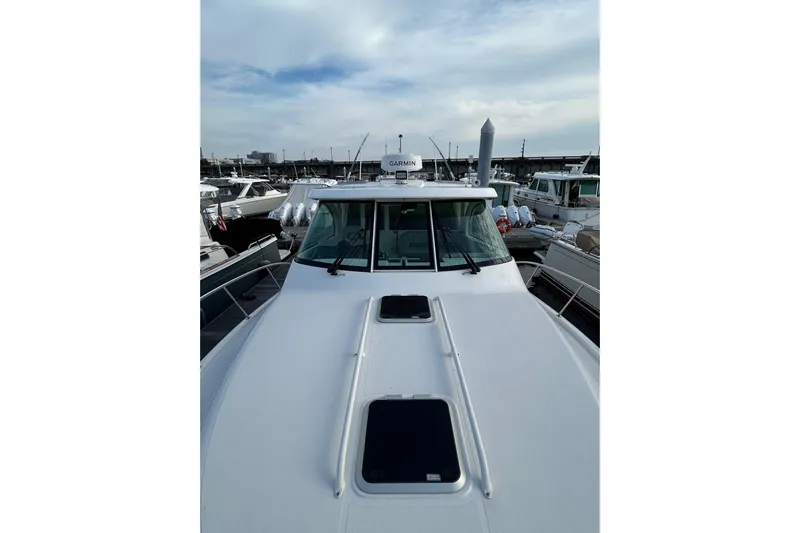The fully integrated hardtop and windshield are engineered to support an optional factory-built tower. Dependable Yamaha® outboards on the transom not only increase her overall performance but also open up valuable space for additional storage and accommodations. Her sleek, express style with a 13-foot beam results in an expansive cockpit and roomy interior below decks. Two available floor plans below deck feature light-colored interior woods, exquisite fabrics and strategically located ports to make the interior spacious, stylish and inviting.