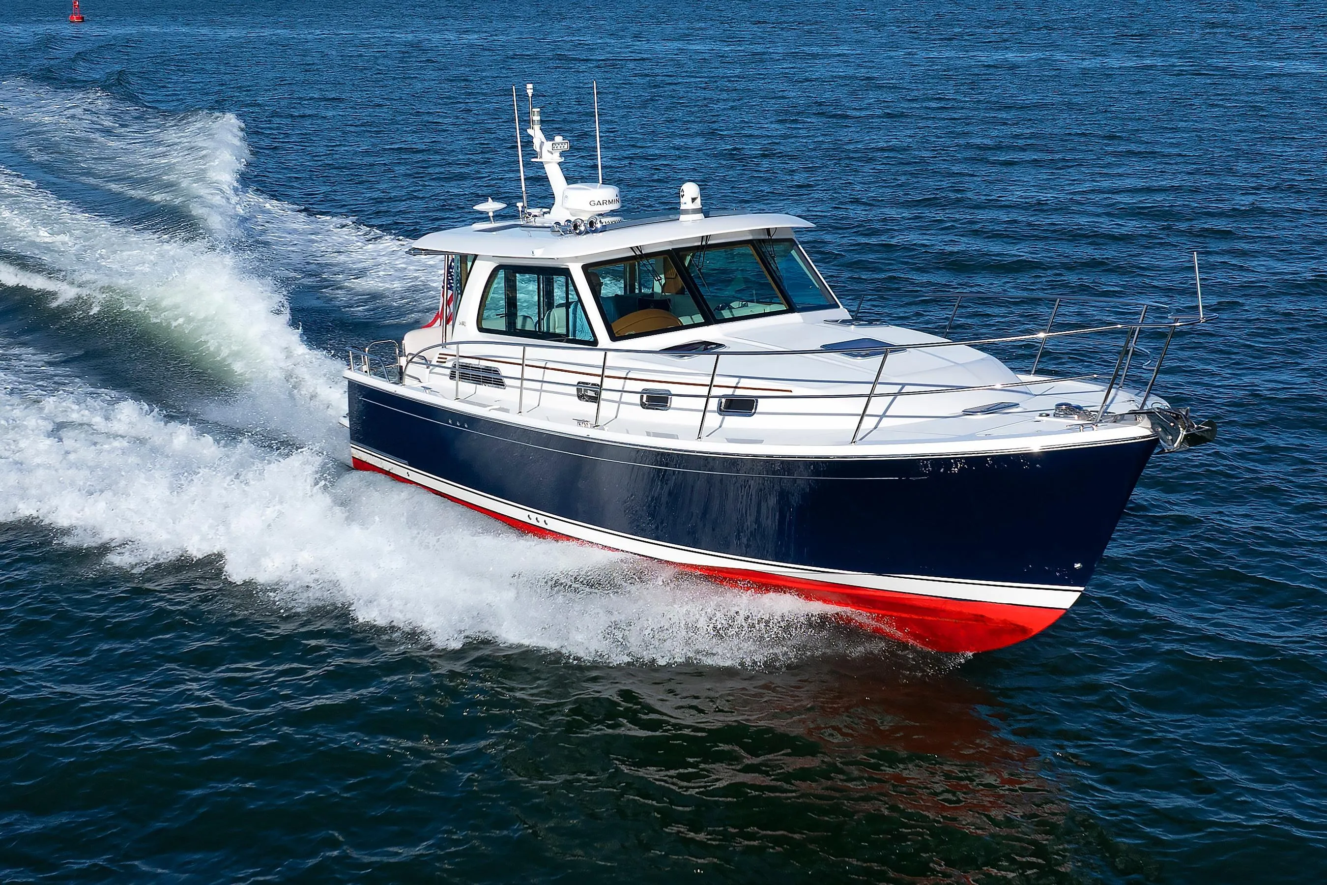 The Sabre 38 Salon Express represents the latest in design and naval architecture. Her exterior profile says Downeast and she is built in the tradition of Maine boat building: beautiful, strong, reliable and very seaworthy. Below her skin, technology is everywhere: from her resin infused laminates, to state of the art systems, and a modern pod propulsion drive. Her hull lines are specifically designed for the installation of pods, which allow increased fuel economy, quiet running and a very pleasant ride.