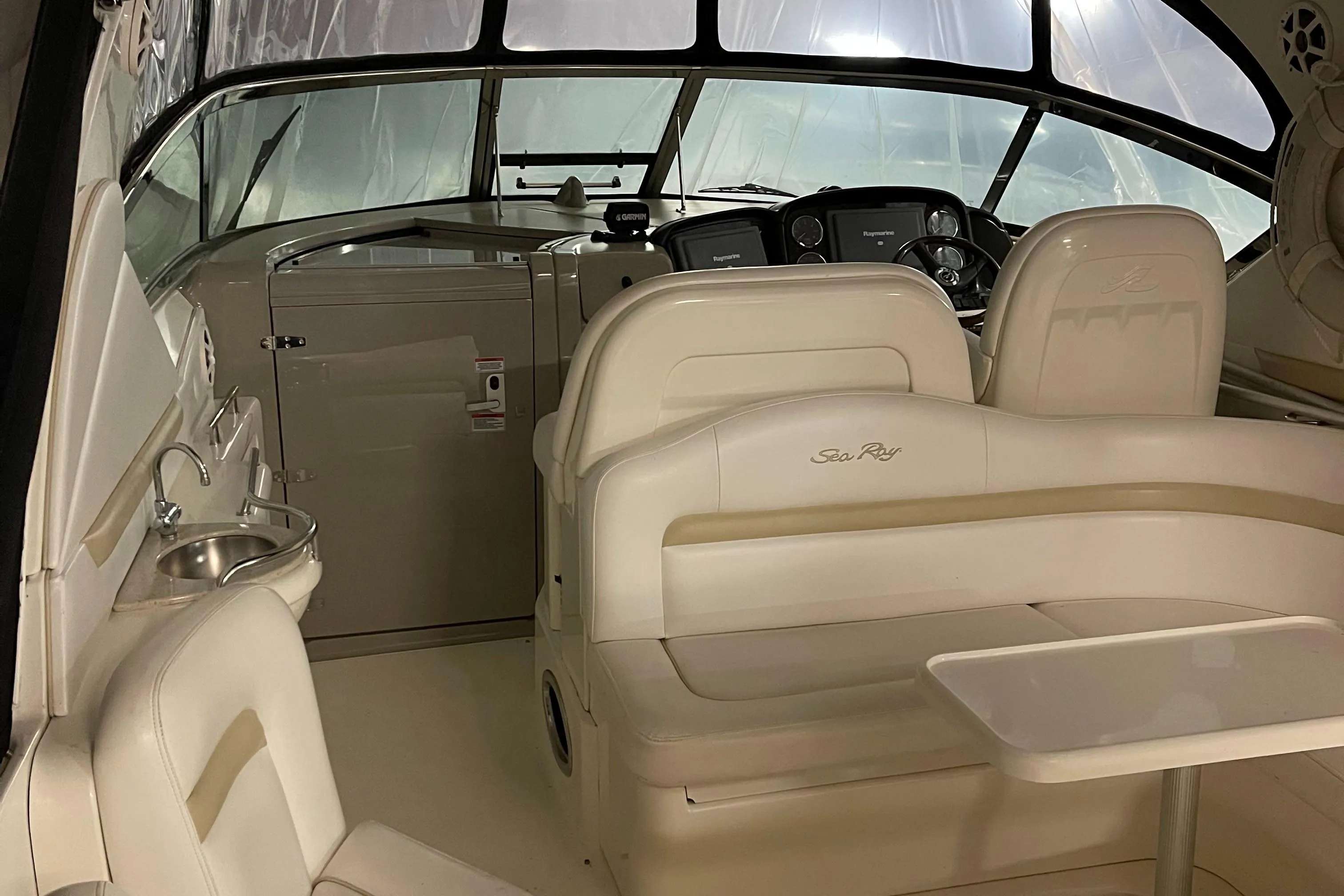 Helm: compass, depth sounder, RayMarine GPS/ plotter, RayMarine radar, autopilot, windshield wipers, Mercruiser Smart Craft system, shift upgrade