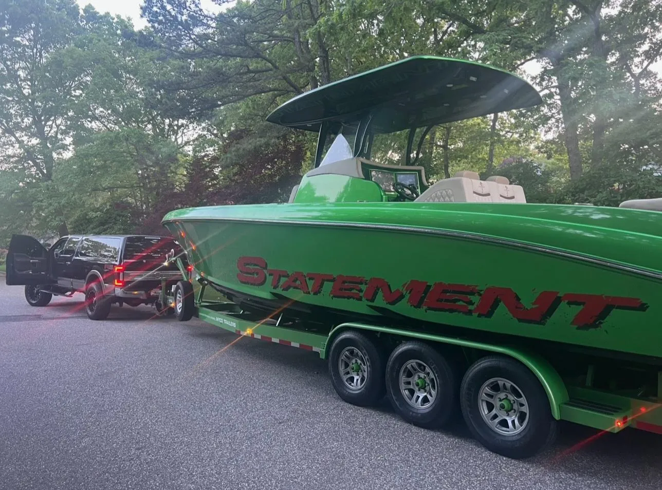 The 380 Open is a center console powerboat built by Statement Marine in St. Petersburg, Florida. It's often used for day-cruising and freshwater or saltwater fishing. The boat has a fiberglass deep-vee hull and is typically powered by outboards. It recently was upgraded tp 3 Mercury 450 Racing outboards. Now the boat reaches speeds of 90+mph.Statement boats are known for their innovative performance and come in many color schemes. This one is a very sharp green scheme with custom interior options.