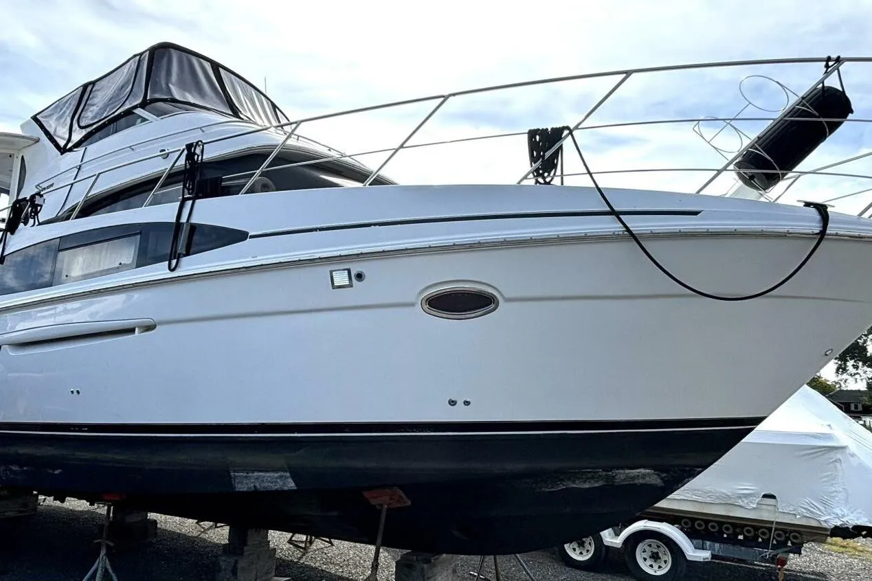 Come check out this beautiful condition, low hour Carver 396 Motor Yacht and experience the openness and ability for living aboard for yourself! Full of factory amenities, as well as recent improvements and maintenance upgrades, she is ready to be dropped in the water or left on hard until next season. Mechanically speaking, the Volvo Penta 8.1 Gi engines are sitting at very low hours (approximately 370 each) with standard maintenance performed regularly. New risers and manifolds were replaced back in 2019 and a REVERSO oil change system was also installed to improve and aid in oil changes. New batteries back in 2023 help to fire the engines up and the upgraded dripless shaft seals ensure a dependable and smooth ride. Other recent updates and improvements include new full canvas (2024), new plugs and wires (2024), new zincs and anodes (2024), new holding tank vent filters (2024), new forward and aft head toilet seals (2024), and rebuilt forward and aft holding tank pumps (2022). Up on the bridge you will find a beautiful layout including an L-shaped lounger surrounding the captain's chair, starboard co-pilot chair and helm station. There is a nice wet bar area and ice maker for entertaining and even more room to roam and expand on the aft deck just a couple steps down. Continue into the cabin where you are greeting with a gorgeous salon, equipped with a leather pull out sofa as well as a love seat. Relax here and enjoy the entertainment center, or continue into the galley, which is fully equipped with a 3 burner electric stove, a microwave, a refrigerator and freezer, a built in coffee maker and plenty of storage! The separate dinette with even more storage is a wonderful space to sit down and have a nice bite to eat. The forward queen stateroom has plenty of storage and closet space, TV/DVD, as well as direct access to the main head with shower. The aft queen master stateroom has even more storage, TV/DVD, and its own private full head with shower. Amenities to help round out this beauty are central vac, 3 zone heat and A/C, a low hour Kohler generator, and bow thruster to make docking and launching a breeze!