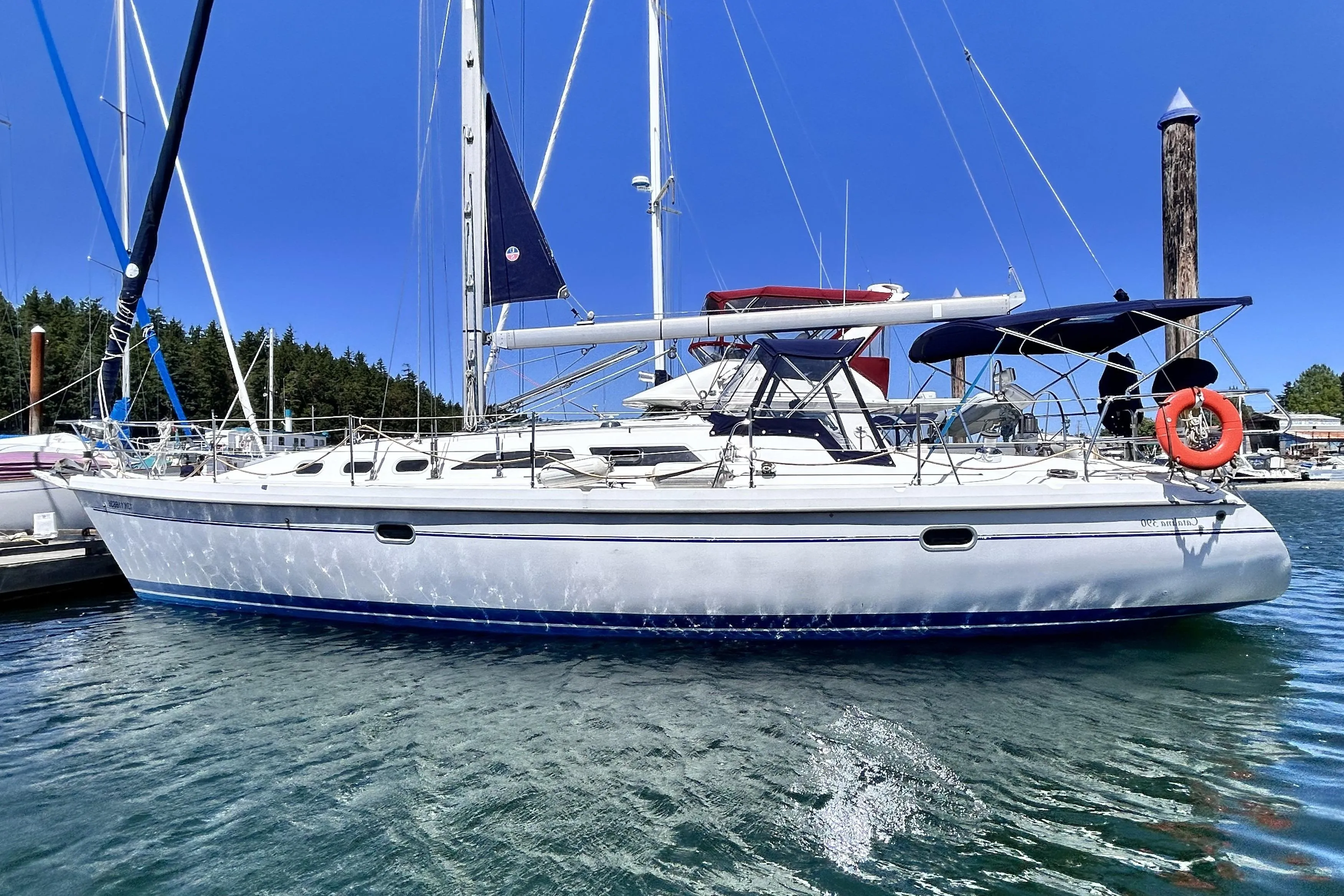 With a walk-through transom, in-mast furling, and a roomy three-cabin layout, this Catalina 390 is a very desirable vessel.