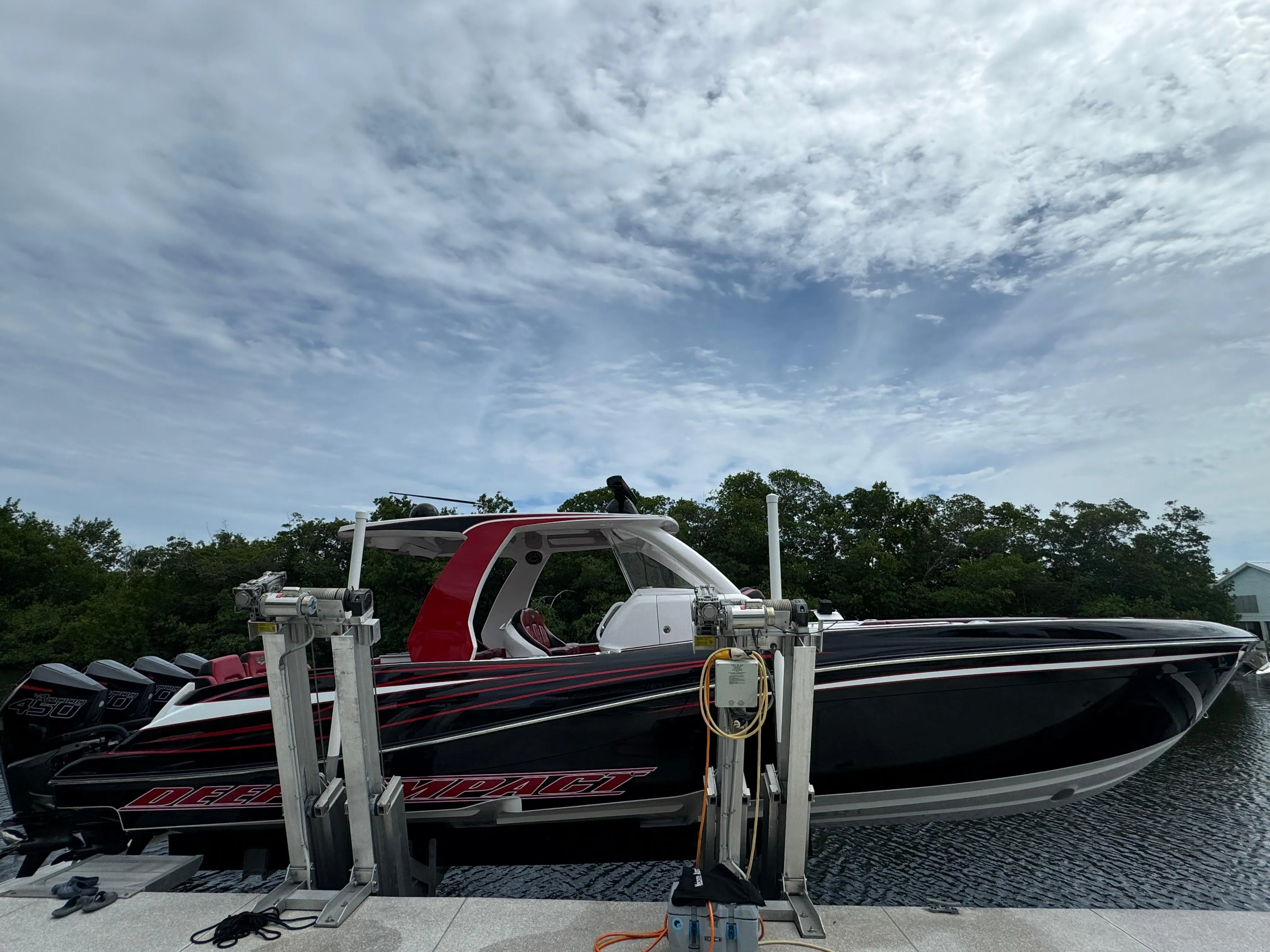 The 2022 39' Deep Impact Center Console is a high-performance boat with a 10'7" beam and a max draft of 2'10". Weighing 17,000 pounds dry, it is powered by four 2024 Mercury Racing 450R outboard engines with 450 HP each and only 70 hours. This vessel combines power, speed, and luxury, making it perfect for serious boating enthusiasts.