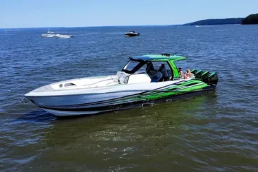 2024 Deep Impact 399 Sport Quad Mercury Racing 500Rs with under 120 hours, Loaded with premium options including Stage 3 custom paint, dual row seating, Myco trailer, bow thruster, windlass, summer kitchen with Yeti cooler, fridge, sink, and trash, recessed shower in the hardtop, custom upholstery, anti-fatigue flooring, and extensive storage.