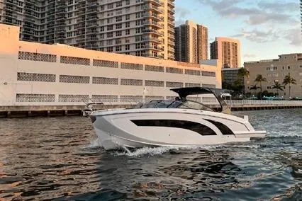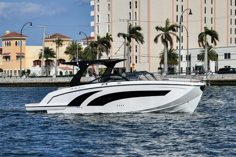 The 377 White balances open-air day boating with genuine overnight comfort. Synthetic-teak decks flow from the bow lounge to the wide swim platform, where a pair of platform stools and a stainless grill turn the transom into a social hub. An electric sunroof opens the cockpit to sky and breeze, while underwater lights set the mood after sunset. Below, the cabin adds a 12,000 BTU A/C, 24″ TV/Blu-ray, induction cooktop, 80 L refrigerator and hot-water system to make weekends aboard easy.