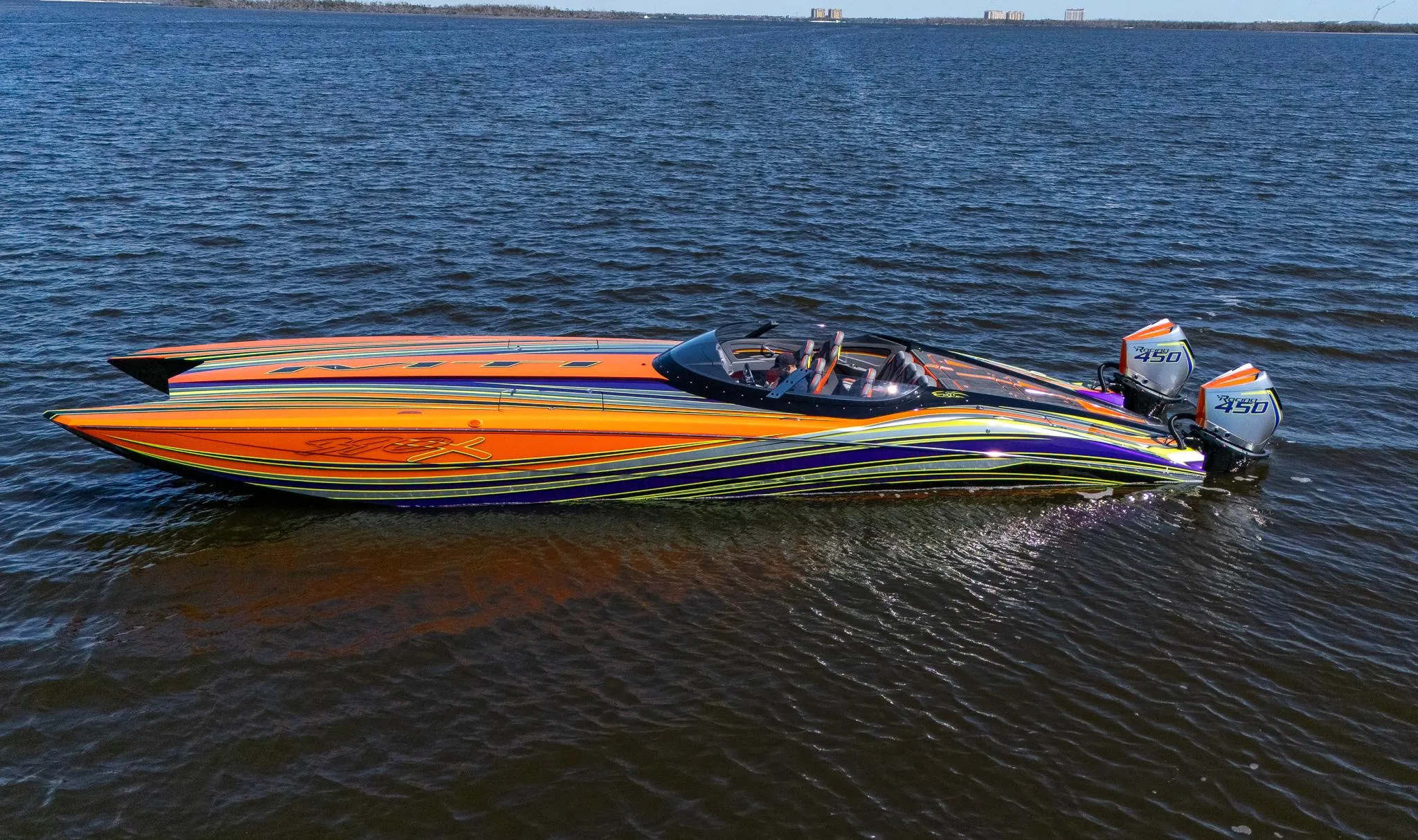 2024 MTI 390X powered by Mercury Racing 450R with 95 Hours. Mercury Warranty through June 2026 with the option to extend an additional 5 years. Custom painted CTS Trailer included.