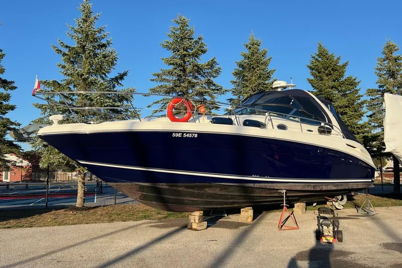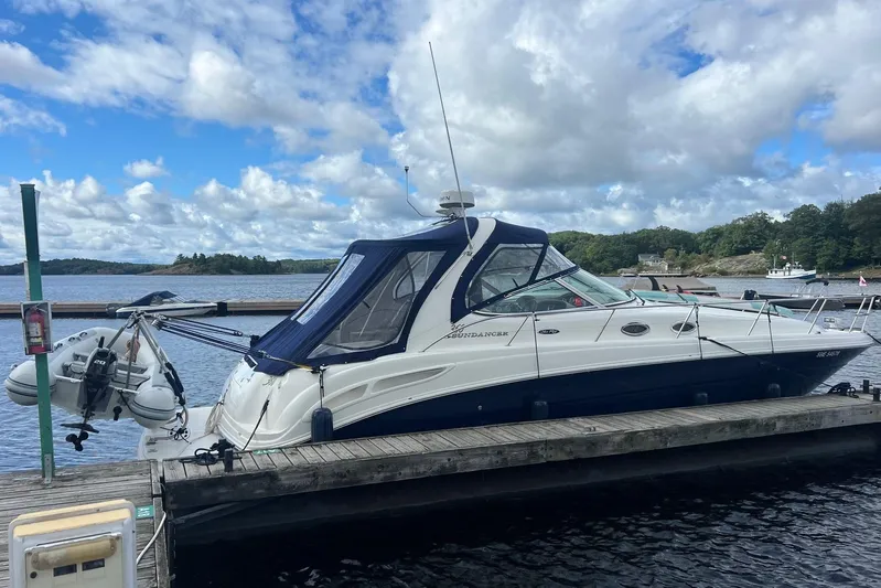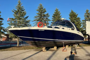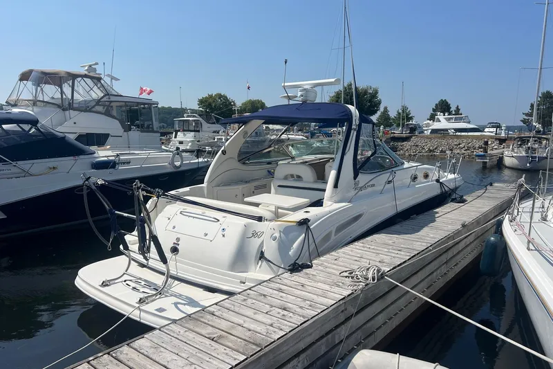 Built on a deep-V hull with moderate beam, the Sundancer’s midcabin interior gets high marks for its quality furnishings and fixtures. This is a comfortable layout with plenty of storage, a built-in entertainment center, a plush Ultraleather lounge, and excellent headroom. A two-part pocket door provides privacy for the forward stateroom, and both the salon sofa and midcabin lounge convert easily into double berths. At the helm, a bucket seat with a flip-up bolster allows for standup driving and there’s space in the tiered, burled dash for electronics. Engine access is excellent; the entire cockpit floor rises on hydraulic rams to completely expose the motors and V-drives. Additional features include an extended swim platform, an underwater exhaust system, a transom storage locker, and a cockpit wet bar. MerCruiser 8.1-liter 370hp V-drive gas engines will cruise the 360 Sundancer at 18 knots and reach a top speed of 30+ knots